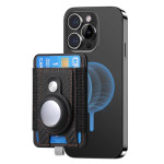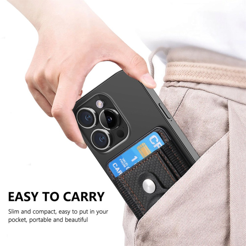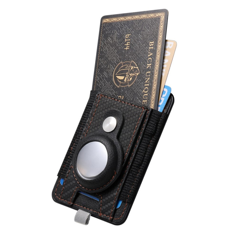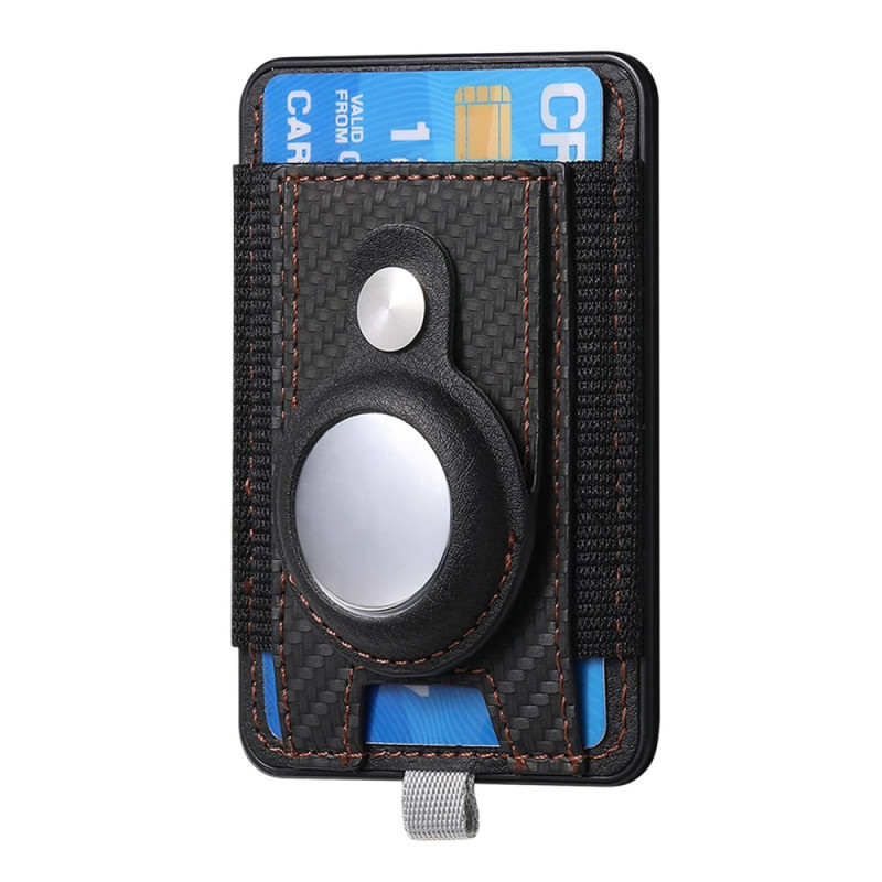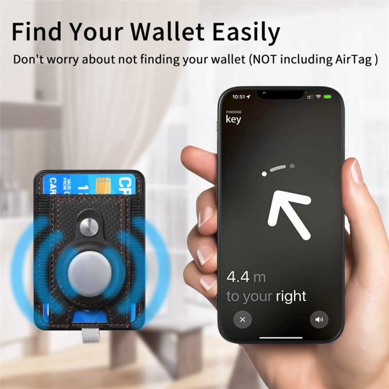Fabriqué en cuir végétalien texturé fibre de carbone, il offre une forte attraction magnétique, un rangement pratique pour vos cartes essentielles et une intégration optimisée pour AirTag.