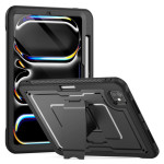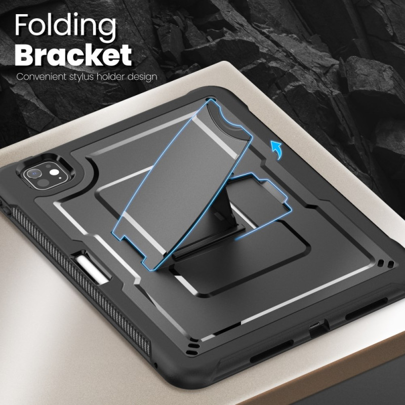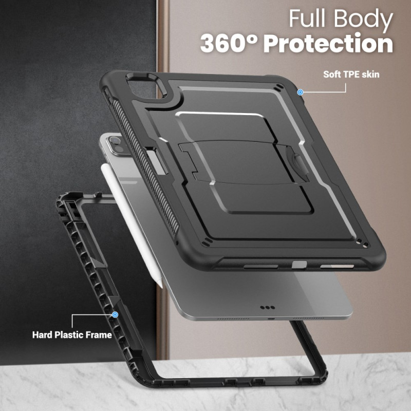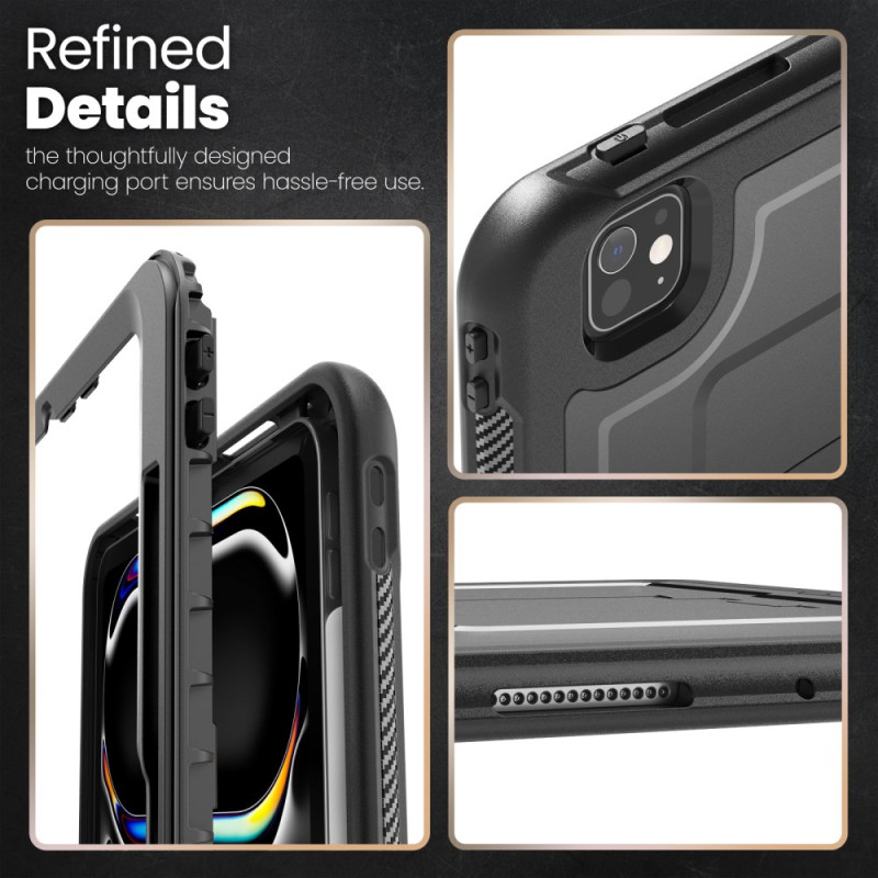 Diese robuste Hülle für das iPad Pro 11 (2025) / 11 (2024) bietet mit ihrer Mischung aus PC und TPE dauerhaften Schutz. Sie verfügt über einen faltbaren Ständer aus Zinklegierung, eine Stiftablage, präzise Schnitte für den einfachen Zugriff auf alle Funktionen, einen erhöhten Kameraschutz und einen abnehmbaren Schultergurt für den bequemen Transport.