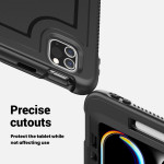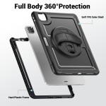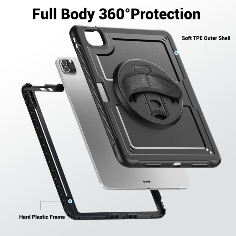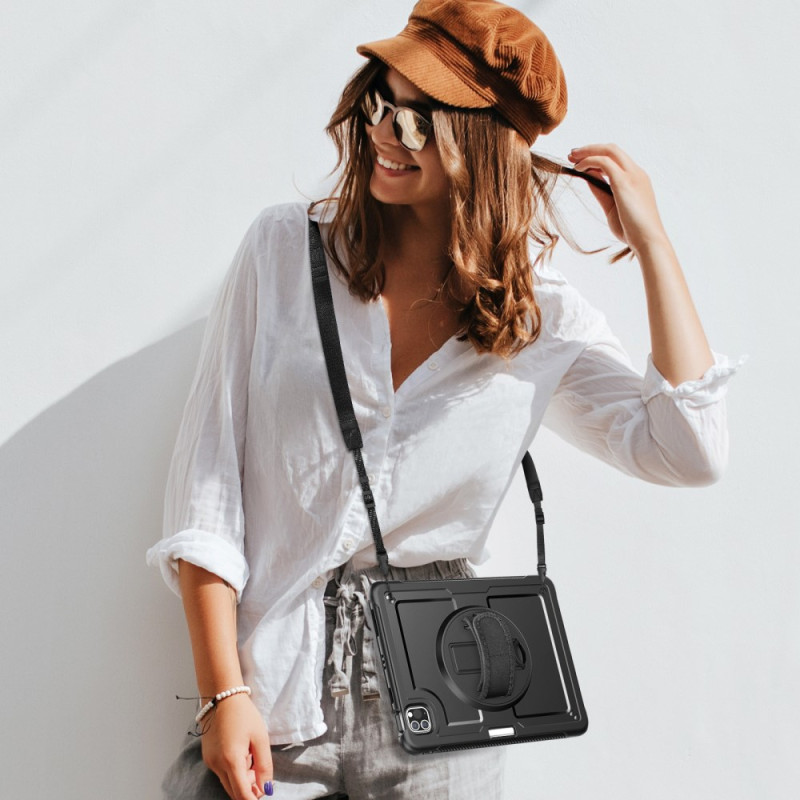 Entdecken Sie unsere robuste Hülle für das iPad Pro 11 (2025) / 11 (2024) mit um 360° drehbarem Ständer, verstellbarer Handschlaufe und abnehmbarem Schultergurt. Sie ist aus PC und TPE gefertigt und bietet einen außergewöhnlichen Schutz vor Kratzern und Stößen. Der drehbare Ständer ermöglicht einen vielseitigen Einsatz, während die Handschlaufe für einen bequemen und sicheren Halt sorgt.