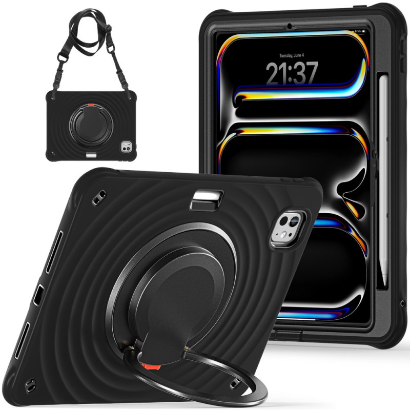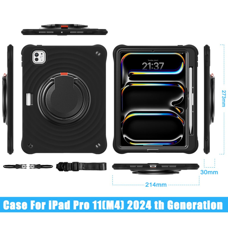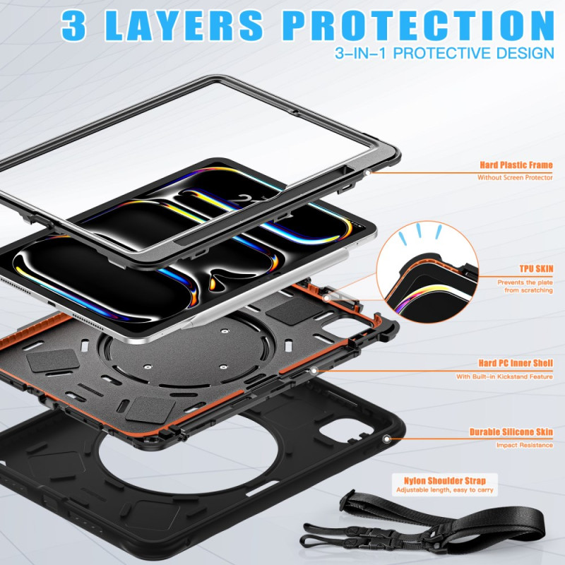 Diese robuste Hülle für das iPad Pro 11 (2025) / 11 (2024) bietet mit ihrem Hybriddesign überlegenen Schutz. Sie verfügt über einen um 360° drehbaren Ständer, einen Stiftschlitz, ein stoßdämpfendes Design und einen drehbaren Griff. Er ist ideal für Arbeit und Freizeit und wird mit einem verstellbaren Schultergurt für den einfachen Transport geliefert.