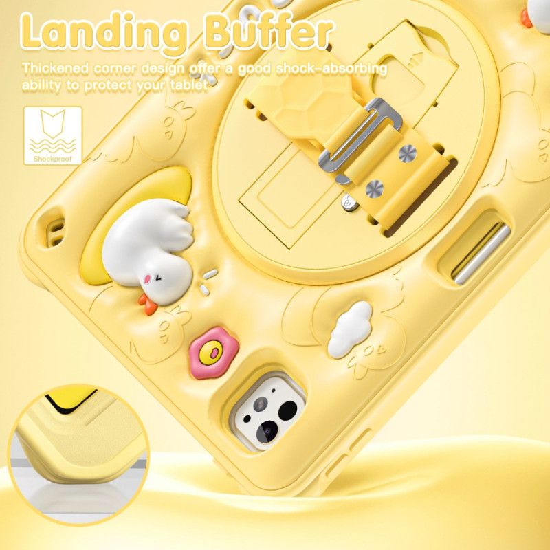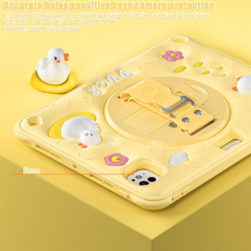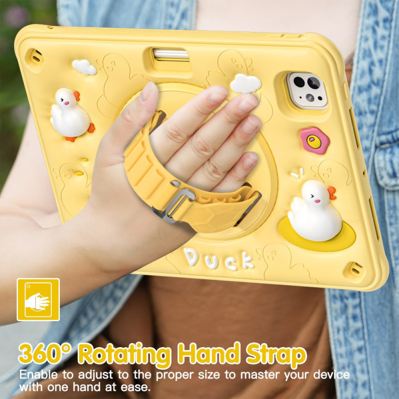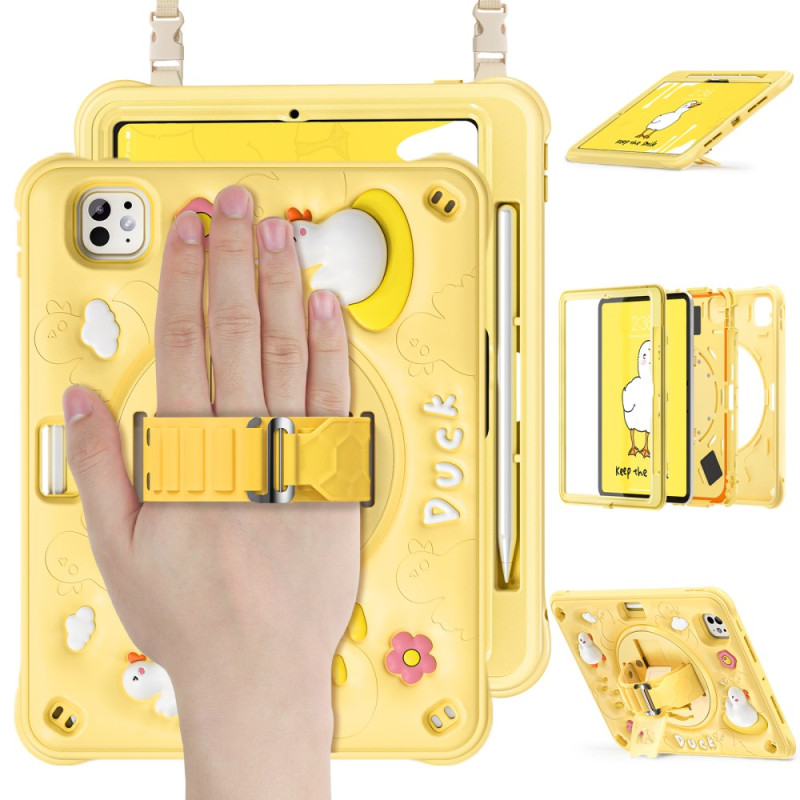 Entdecken Sie unsere innovative Hülle für das iPad Pro 11, die Schutz und Stil vereint. Mit einem praktischen Ständer, einem abnehmbaren Schultergurt und einem niedlichen Entenmuster bietet sie einen mehrschichtigen Schutz mit verstärkten Ecken. Der um 360° drehbare Griff sorgt für einen bequemen Halt und ist ideal für den täglichen Gebrauch.