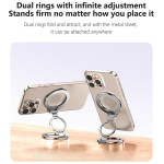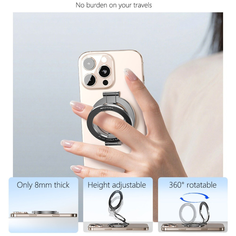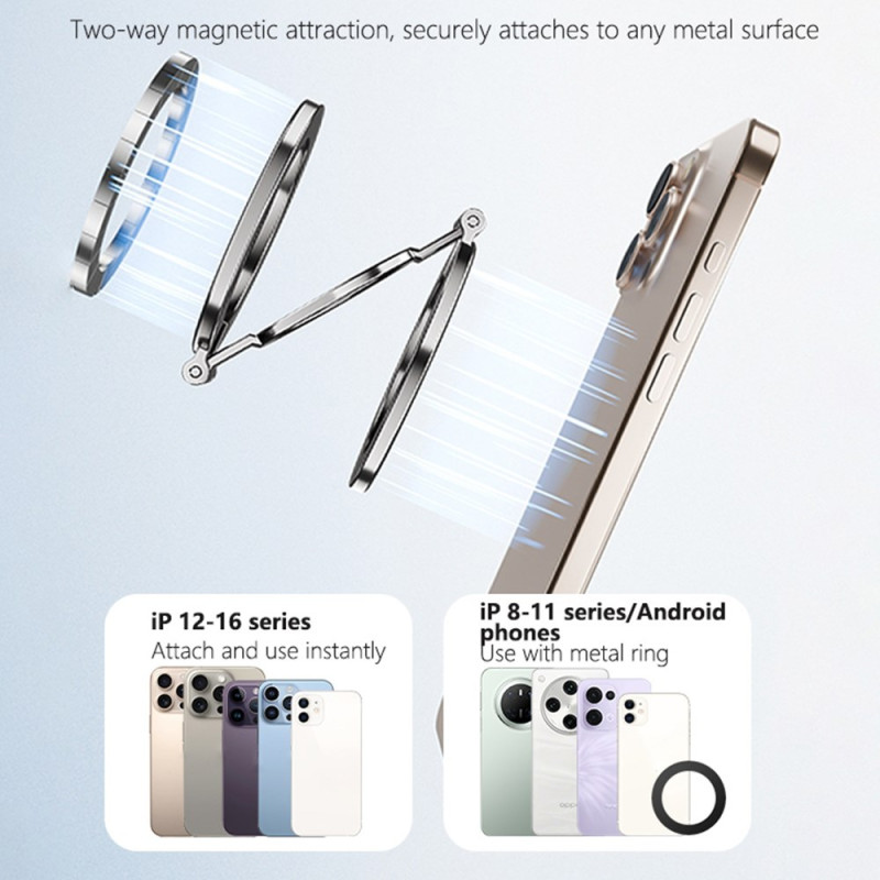 Diese aus einer hochwertigen Zinklegierung hergestellte Halterung definiert die Vielseitigkeit der magnetischen Befestigung für den mobilen Nutzer neu. Ausgestattet mit starken Magneten auf beiden Seiten, sichert sie das Handy und haftet gleichzeitig an Metalloberflächen (wie z. B. Fitnessstudio- oder Bürogeräten). Die doppelte 360-Grad-Drehung ermöglicht eine Multi-Winkel-Anpassung für horizontales oder vertikales Betrachten. Der mittlere Ring dient als Halterung für große Smartphone-Größen und verbessert die Griffigkeit. Dank des Klappmechanismus lässt sich die Halterung leicht verstauen, was sie zu einem wichtigen Accessoire für unterwegs macht.