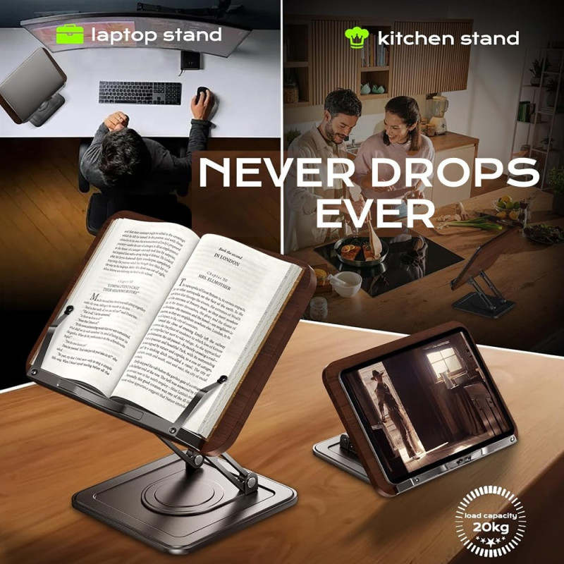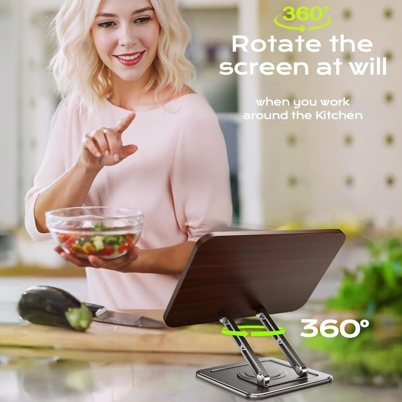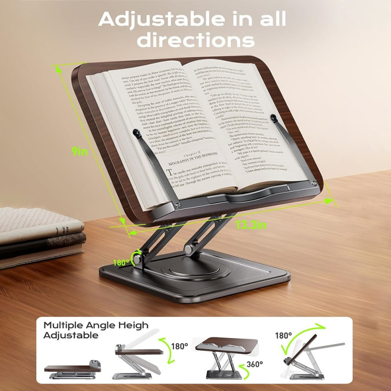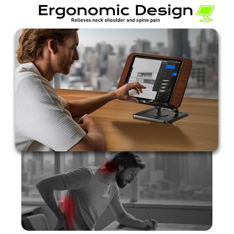 Von der natürlichen Eleganz des Holzes bis hin zur Robustheit des Karbonstahls ist dieser Ständer die vielseitige Lösung für jeden Arbeitsbereich. Hergestellt aus MDF und Karbonstahl, garantiert er zuverlässige Stabilität beim Arbeiten oder direkten Schreiben. Die Einstellung in sieben Höhenstufen ermöglicht es dem Nutzer, den idealen Blickwinkel zu finden, korrigiert die Körperhaltung und verringert die Ermüdung der Augen. Die 360-Grad-Drehbarkeit bietet ultimative Flexibilität und ermöglicht es, den Blickwinkel für Laptops, Tablets oder Bücher anzupassen.