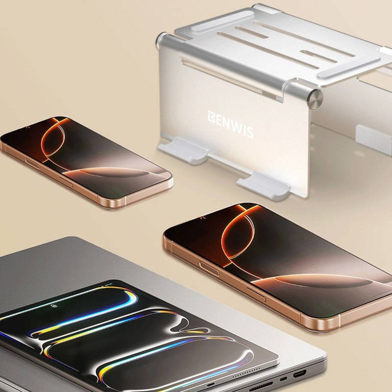 Hervorragendes Design zeigt sich in der Fähigkeit eines Zubehörs, mehrere Rollen zu erfüllen, ohne seine minimalistische Ästhetik zu beeinträchtigen. Dieser BENWIS-Ständer ist vollständig CNC-gefräst aus einer Aluminiumlegierung und bietet eine 3-in-1-Lösung für Laptops, Tablets und vertikale Aufbewahrung. Sein Profil ist ultraportabel und misst im zusammengeklappten Zustand nur 16 mm. Das Aufklappen erfolgt sofort (eine Sekunde), was eine schnelle Installation erleichtert. Silikonkufen sorgen für absolute Stabilität. Er eignet sich ideal zur Organisation von Büroflächen, indem er die vertikale Aufbewahrungsfunktion für Festplatten oder Tablets nutzt.