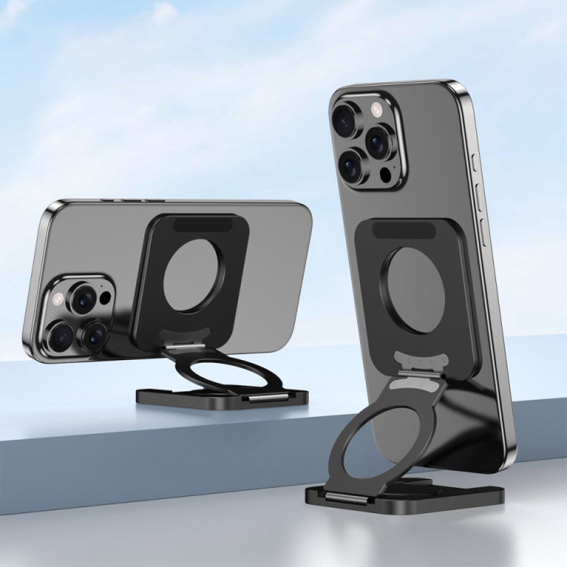 Der doppelseitige magnetische Telefonhalter bietet ein reibungsloses und elegantes Nutzungserlebnis dank seines Designs aus einer Aluminiumlegierung für die Luftfahrt und rutschfestem Silikon. Sein doppelseitiges Magnetsystem ermöglicht eine 360°-Drehung und eine mehrfache Winkelverstellung, ideal für den Hoch- und Querformatmodus. Ultradünn (nur 10 mm im zusammengeklappten Zustand), passt es problemlos in eine Tasche oder einen Beutel. Stabil, leicht und mit allen MagSafe-Modellen kompatibel, eignet er sich für Smartphones und Tablets für das Büro, zum Streamen, für Videogespräche oder zur Verwendung im Auto.