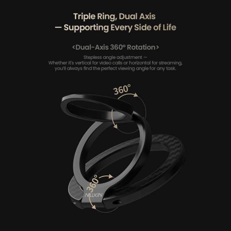 Der ultradünne, drehbare Magnethalter mit Multi-Winkelring vereint Eleganz und Innovation für den gehobenen Alltagsgebrauch. Inspiriert von dem Konzept "Order and Freedom" kombiniert er die Leichtigkeit der Aramidfaser mit Flugzeugaluminium für ein raffiniertes und langlebiges Design. Sein zweiachsiger Ring bietet einen bequemen und stabilen Griff, der ideal ist, um die Benutzung des Telefons zu sichern. Dank seiner unendlichen Winkelanpassung eignet er sich sowohl für das Hoch- als auch für das Querformat. Seine doppelseitige magnetische Struktur ermöglicht nahtlose Übergänge zwischen verschiedenen Medien, ohne dass der Ständer abgenommen werden muss.