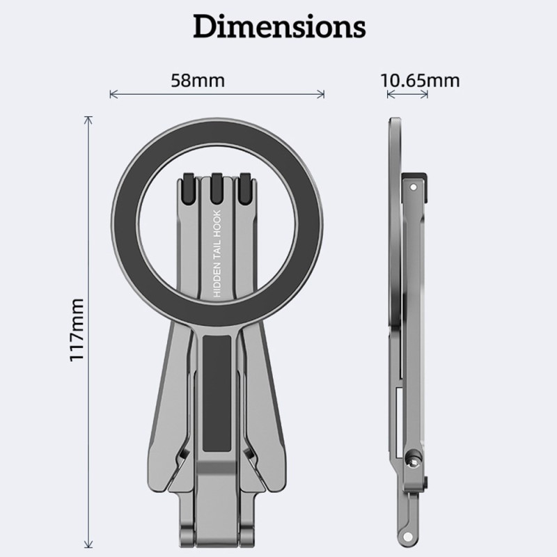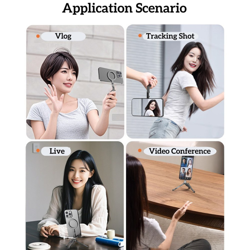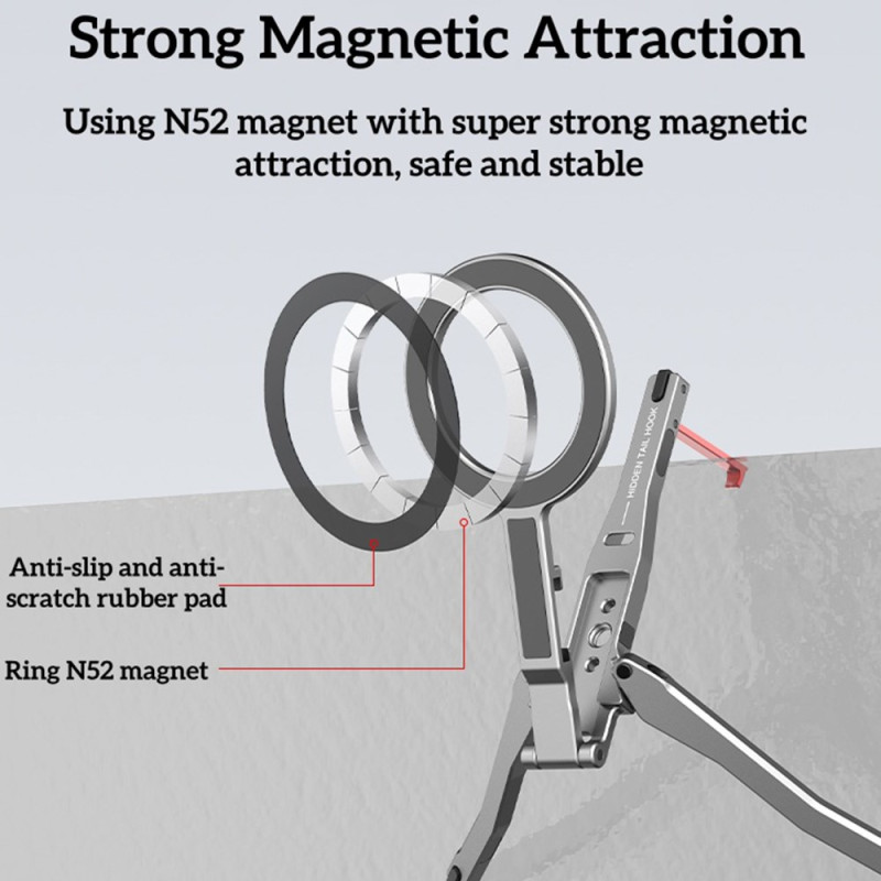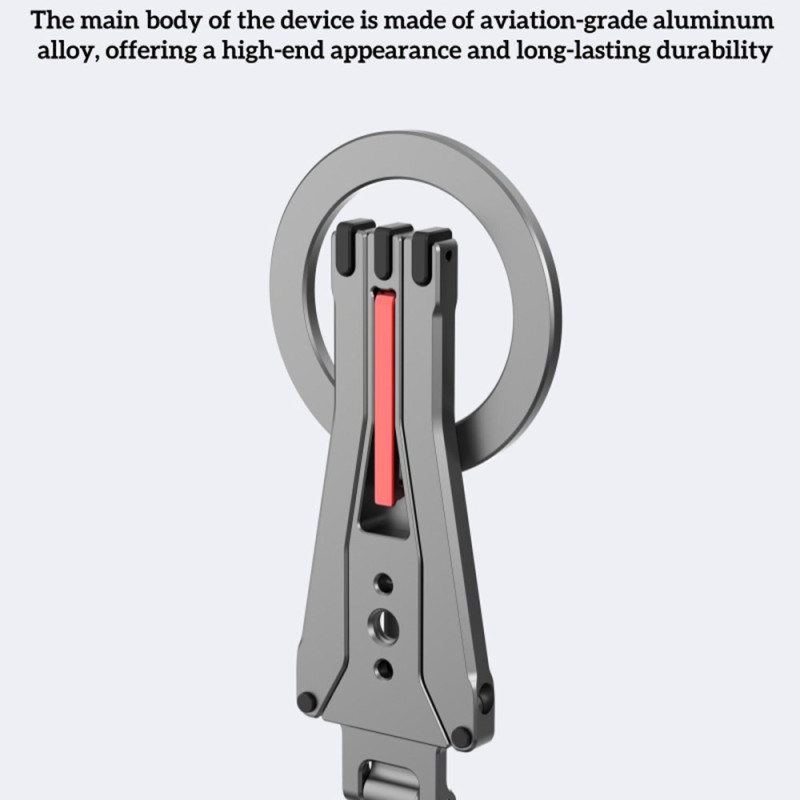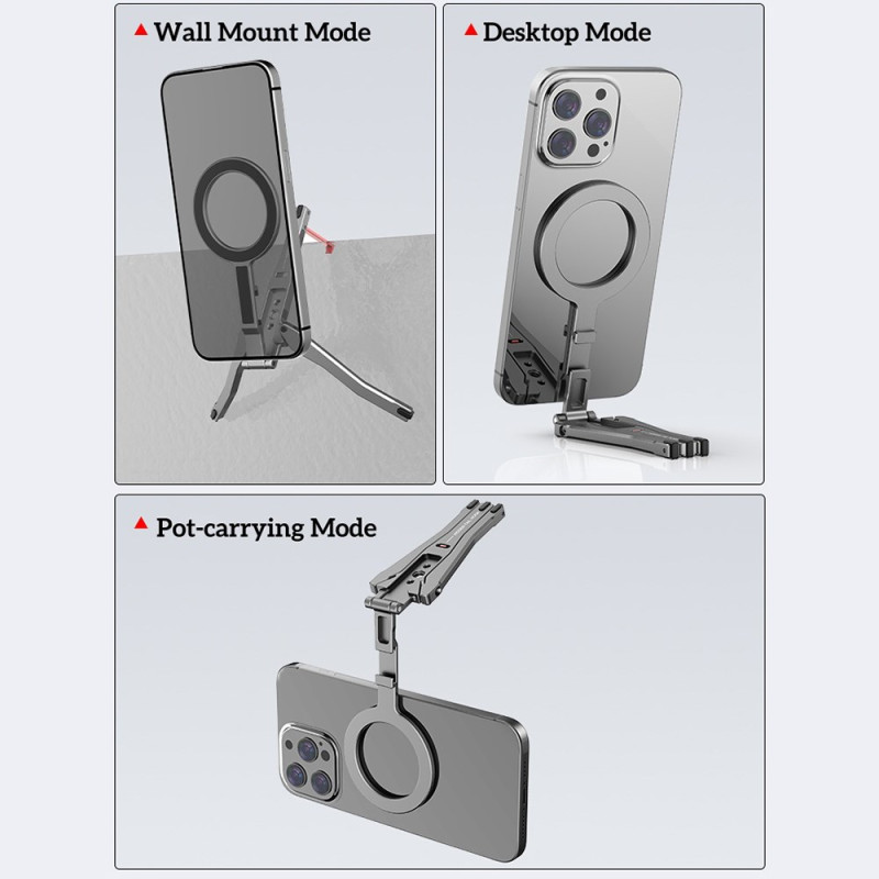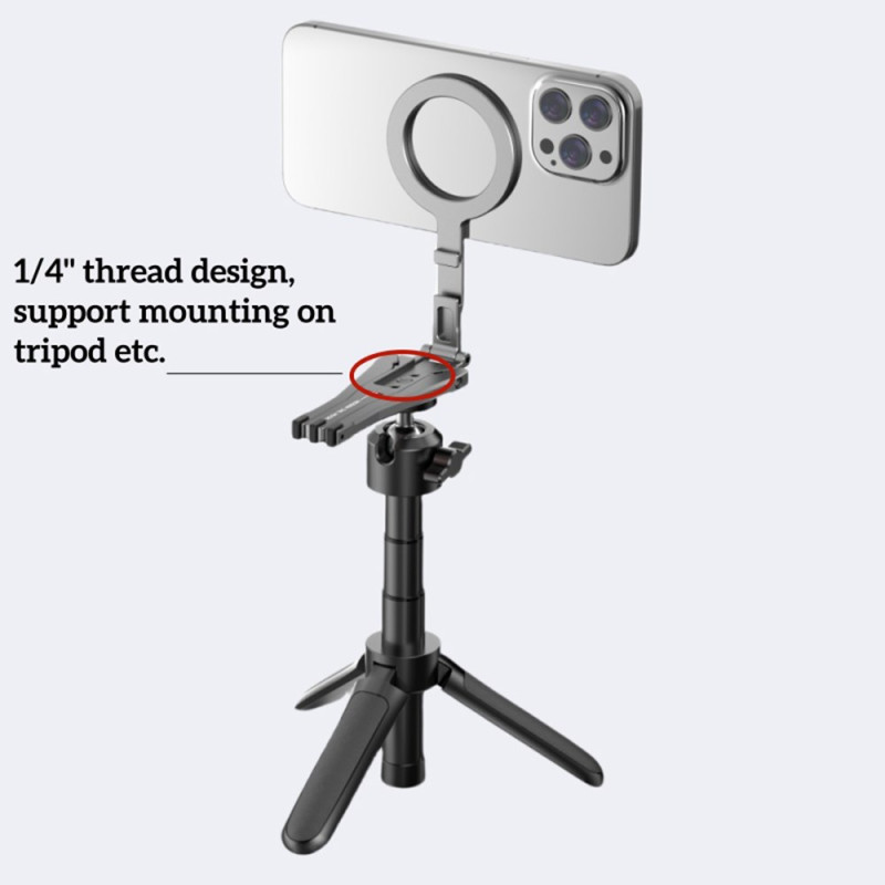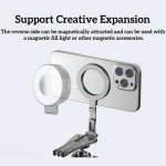 Diese magnetische Halterung ist ein zusammenklappbares Stativ, das für ein vielseitiges und ultrapraktisches Freihand-Erlebnis entwickelt wurde. Er ist dank direkter magnetischer Haftung oder MagSafe-Hüllen mit den iPhone-Modellen 12 bis 16 kompatibel und kann über den mitgelieferten Magnetring auch andere Smartphones aufnehmen. Sie ist aus einer leichten, robusten Aluminiumlegierung gefertigt und verfügt über starke Aluminium-Eisen-Bor-Magneten für einen sicheren Halt. Zusammengeklappt ist sie kompakt (117 × 58 × 10,65 mm) und wiegt nur 60 g. Sie kann je nach Bedarf als Stativ, Tischständer oder Kippständer verwendet werden.