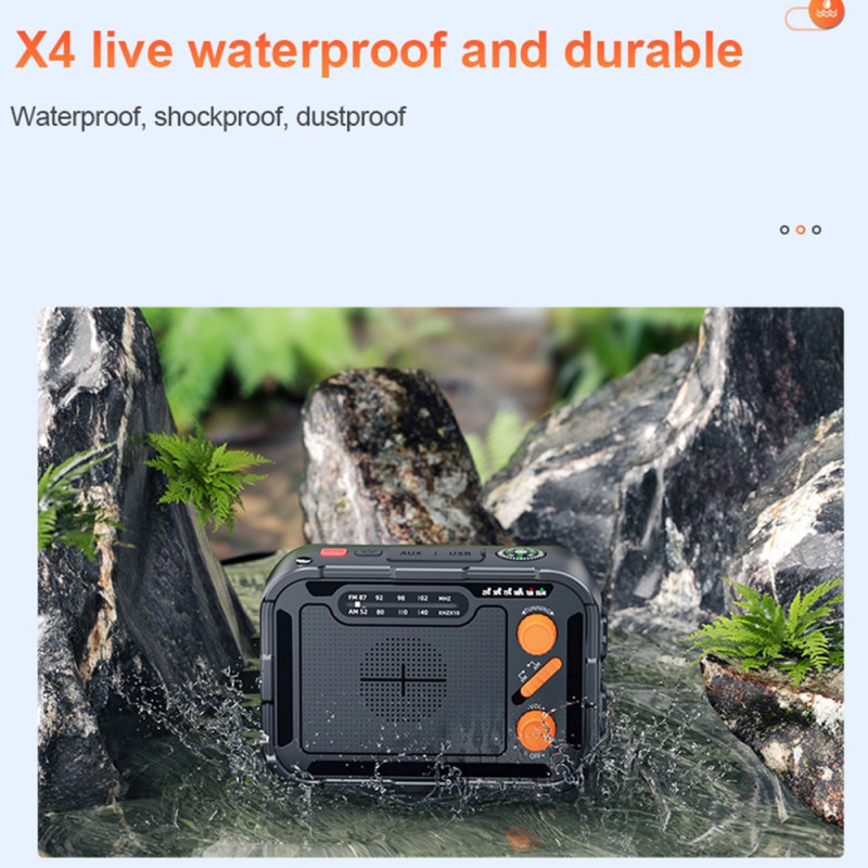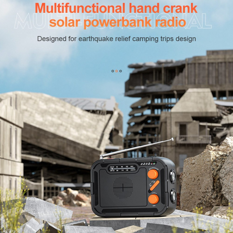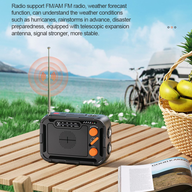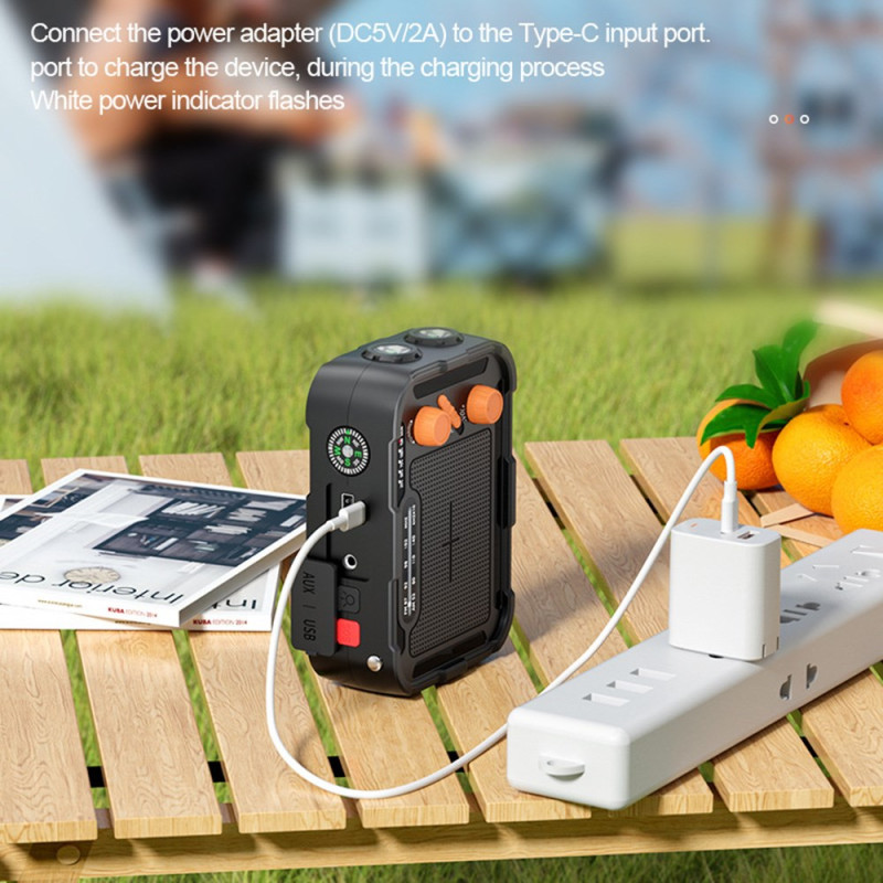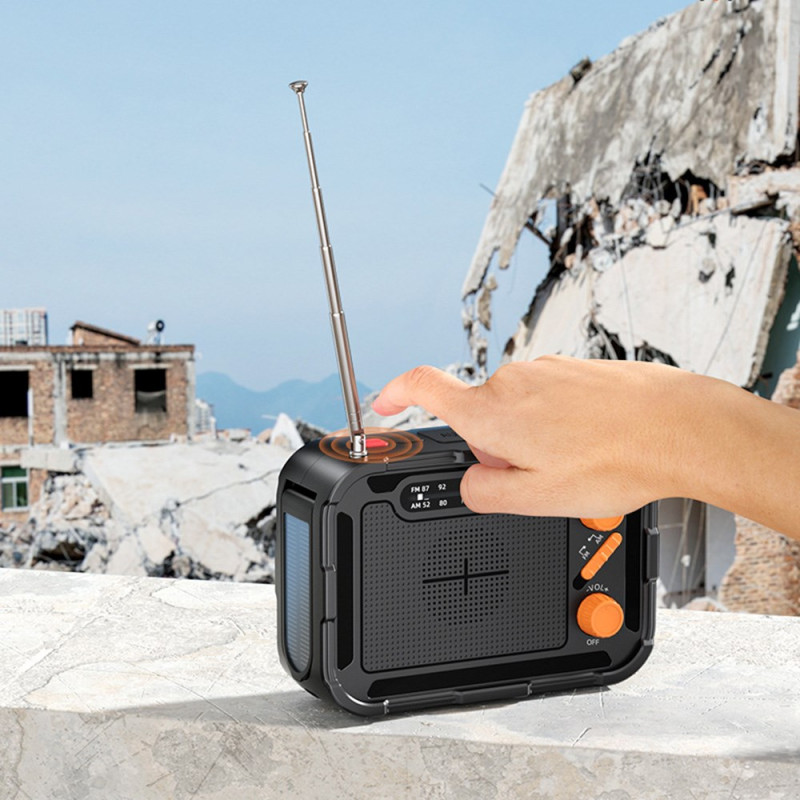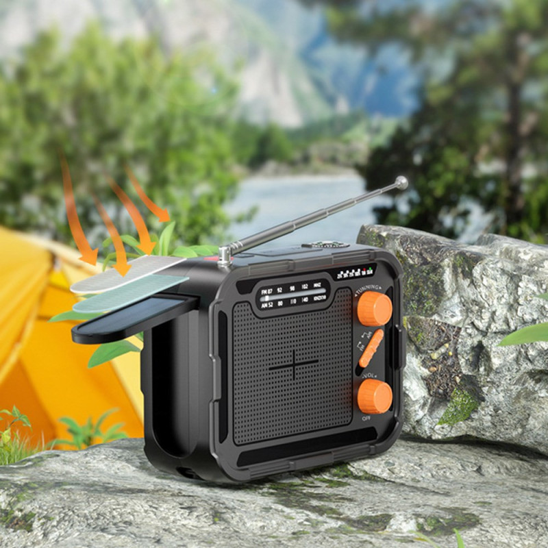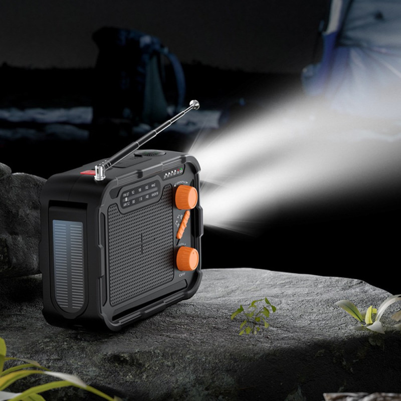La batterie d’urgence multifonction Outdoor 5000mAh combine charge solaire, manivelle et radio FM/AM pour une autonomie totale en extérieur. Équipée d’un panneau solaire 5.5V/55mA, d’une sortie USB-A 5V/2.1A et d’un port Type-C, elle se recharge dans toutes les conditions. Son double éclairage LED (1W 120 lumens + 6W 500 lumens) éclaire efficacement les zones proches ou lointaines. Compacte, légère (300 g) et fabriquée en ABS ignifugé, elle intègre une batterie polymère 5000mAh fiable, idéale pour le camping et les urgences.