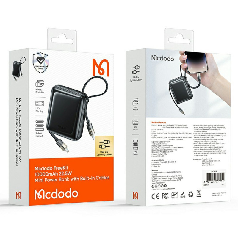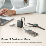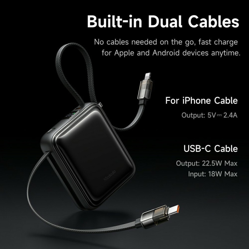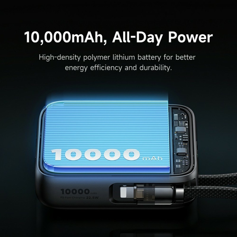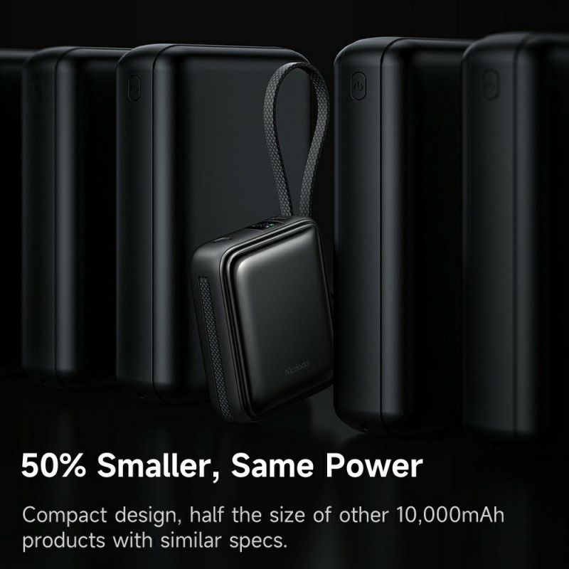 Leistung mit hoher Kapazität und ein ultrakompaktes Format sind jetzt in dieser tragbaren Energielösung vereint. Dieser Externe Akku 10000mAh wurde so konzipiert, dass er dank seiner Miniaturgröße (73 x 63,5 mm) und der integrierten Kabel möglichst wenig Platz einnimmt. Er liefert eine maximale Ausgangsleistung von 22,5 W und sorgt so für ein ultraschnelles Aufladen Ihrer Geräte. Das Aufladen des Akkus selbst wird mit einem schnellen 18W-Eingang optimiert. Das digitale Display ermöglicht eine genaue Überwachung des Ladezustands und garantiert ein müheloses Akkumanagement.