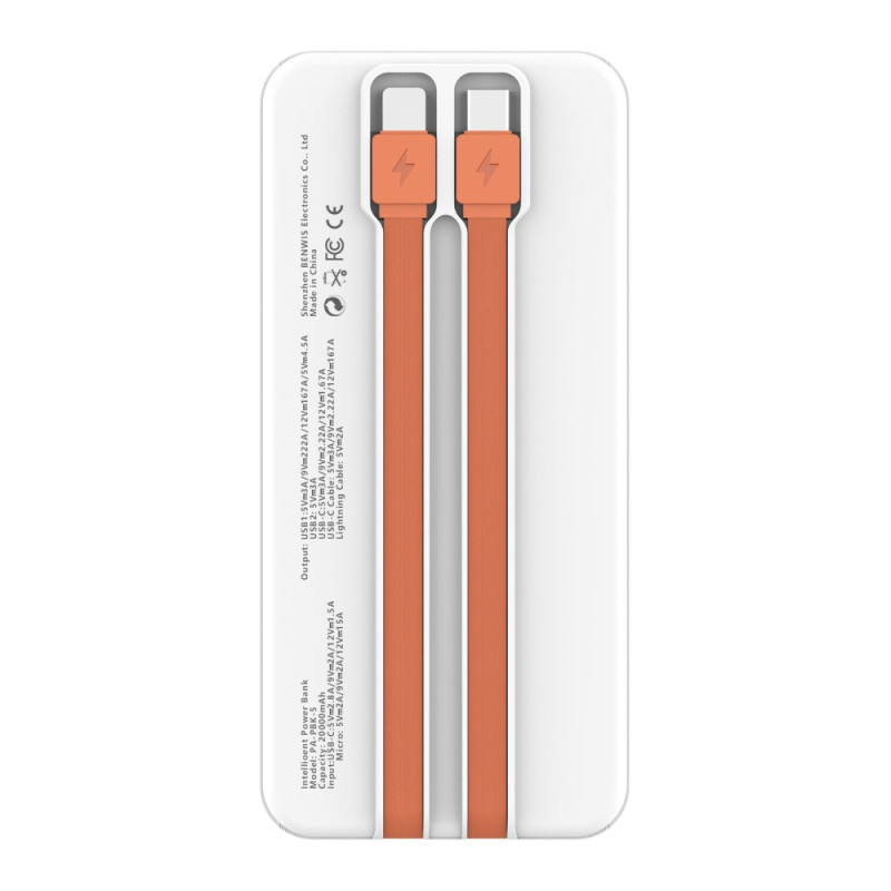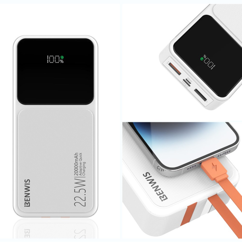Der sofortige Zugang zu Energie für alle Geräte ist die Priorität dieser Externen Batterie von BENWIS, die für die organisatorische Effizienz entwickelt wurde. Mit einer Kapazität von 20000mAh garantiert er mehrfache Aufladungen. Das Design integriert USB-C- und Lightning-Kabel, sodass keine zusätzlichen Kabel mitgeführt werden müssen. Die Ausgangsleistung beträgt bis zu 22,5W und gewährleistet ein schnelles Aufladen über die Anschlüsse und das integrierte Typ-C-Kabel. Sein intelligentes Managementsystem schützt die Gesundheit der angeschlossenen Geräte. Die präzise LED-Anzeige hält Sie über die Akkulaufzeit auf dem Laufenden, und das Ganze entspricht den europäischen Sicherheitsstandards.