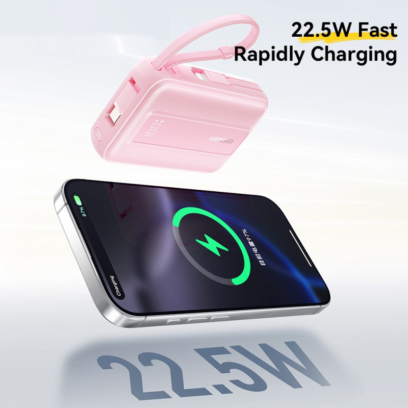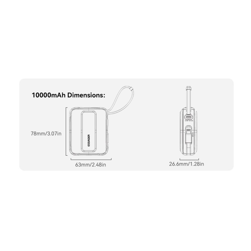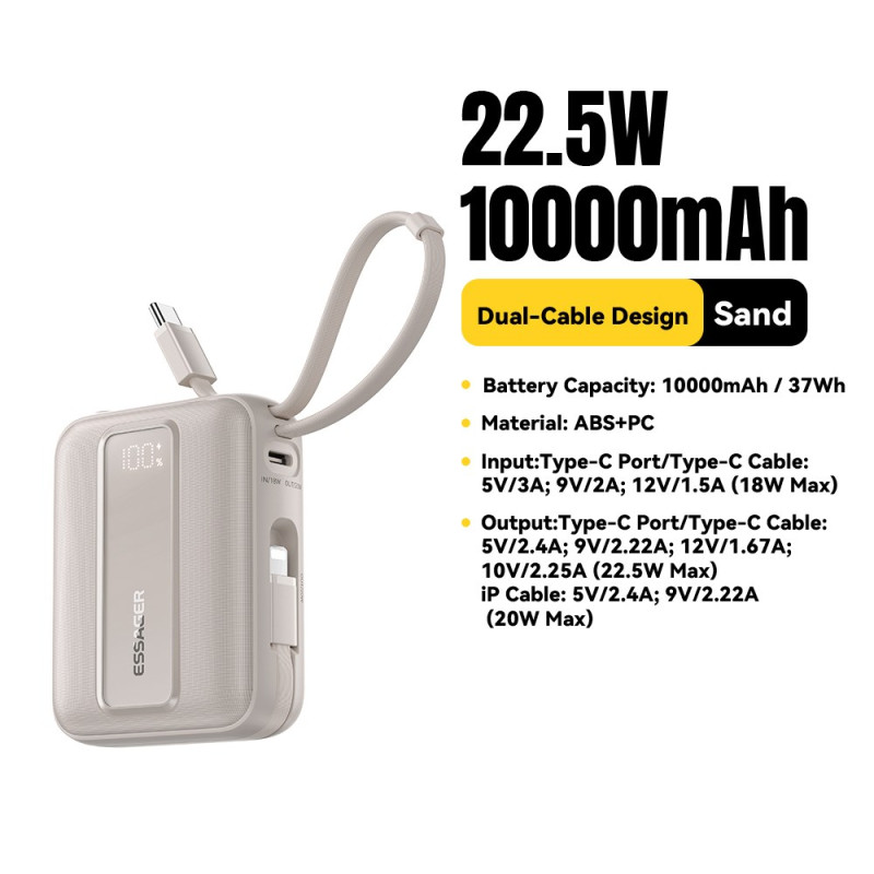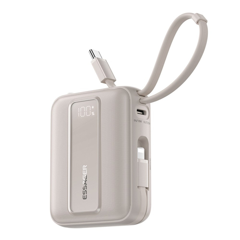 Die optimierte Verwaltung Ihrer Geräte und das Aufladen über mehrere Standards sind jetzt in einem kompakten Format zugänglich. Dieser ESSAGER Externe Akku 10000mAh eliminiert den Platzbedarf durch die Integration von Typ-C- und Lightning-Kabeln, wodurch eine universelle Kompatibilität gewährleistet wird. Sie liefert eine Schnellladeleistung von bis zu 22,5 W, sodass bis zu drei Geräte gleichzeitig aufgeladen werden können. Das System verfügt über 7 Lagen Stromkreisschutz und eine intelligente Temperaturkontrolle für ein zuverlässiges und sicheres Laden. Das intelligente digitale Display bietet eine klare und präzise Überwachung der Akkulaufzeit. Das gesamte Paket ist CE- und RoHS-konform und belegt damit seine Zuverlässigkeit für den europäischen Markt.