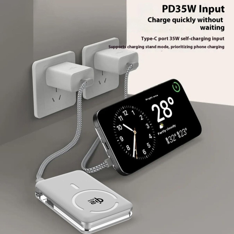 Dieser magnetische externe Akku vereint Leistung und Praktikabilität, um dich auf deinen Reisen zu begleiten. Dank der Qi2.2-Technologie bietet sie schnelles kabelloses Laden mit bis zu 25 W, während ihre Typ-C-Anschlüsse kabelgebundenes Laden mit bis zu 35 W für kompatible Geräte ermöglichen. Seine integrierte Halterung macht es einfach, das Telefon während des Ladevorgangs freihändig zu benutzen. Mit seiner Kapazität von 10000mAh und seinem kompakten Format bleibt er leicht zu transportieren, und sein digitales Display sorgt für eine klare Überwachung des Energiezustands.