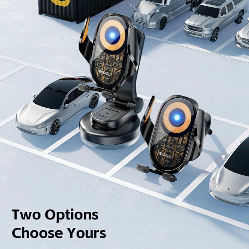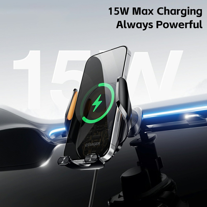 Laden Sie Ihr Smartphone sicher mit dieser kabellosen 15W-Ladehalterung für das Auto auf. Ausgestattet mit einer automatischen Sensorklemme für die Einhandbedienung, einer 360°-Drehung für einen optimalen Betrachtungswinkel und einem dreiachsigen Stoßdämpfungssystem. Genießen Sie ein schnelles und sicheres Aufladen auf allen Reisen.