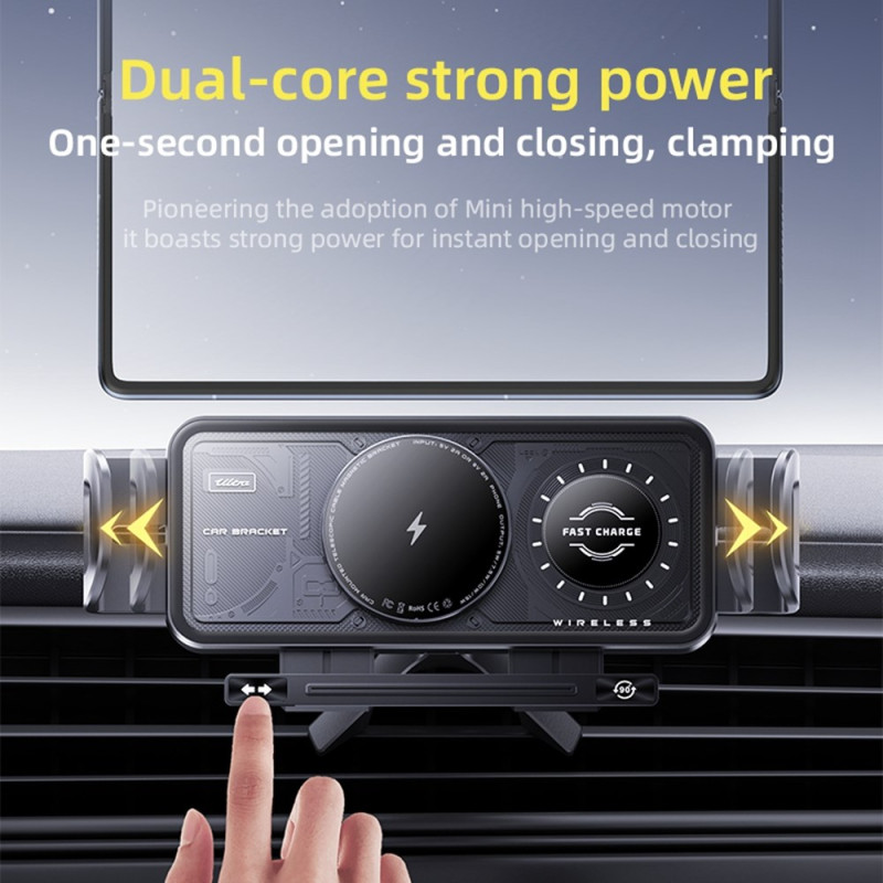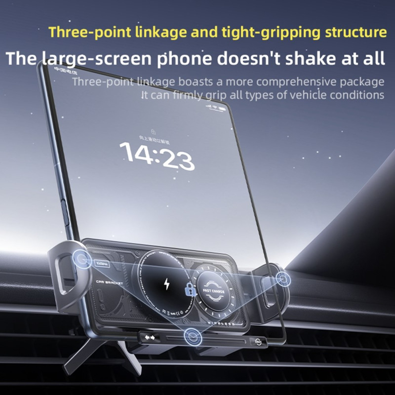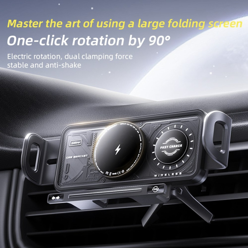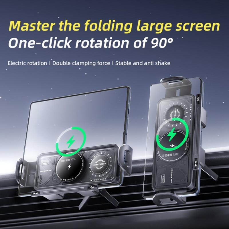 Entdecken Sie die SD04 Autohalterung mit 15W kabellosem Ladegerät. Sie wurde für faltbare und klassische Smartphones entwickelt und bietet eine elektrische 360°-Drehung, eine automatische Freigabefunktion und eine einfache Anbringung am Lüftungsgitter...