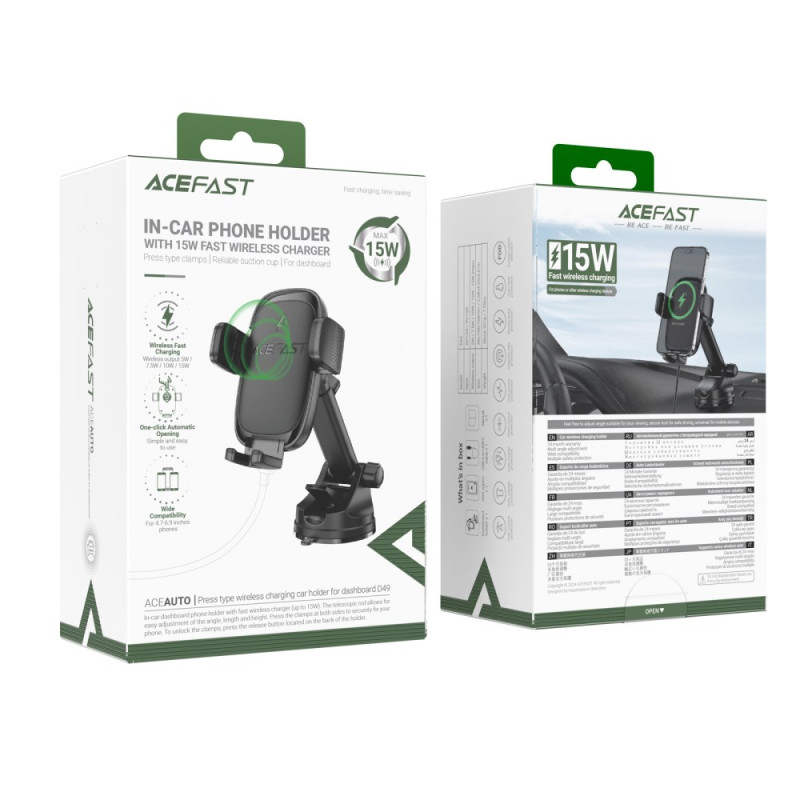 Kabellose ACEFAST-Kfz-Halterung mit 15W-Schnellladung. Sicheres mechanisches Verriegelungssystem und repositionierbarer Saugnapf. Kompatibel mit allen Smartphones von 4,7 bis 6,9 Zoll. Flexible Installation am Armaturenbrett oder an der Windschutzscheibe.