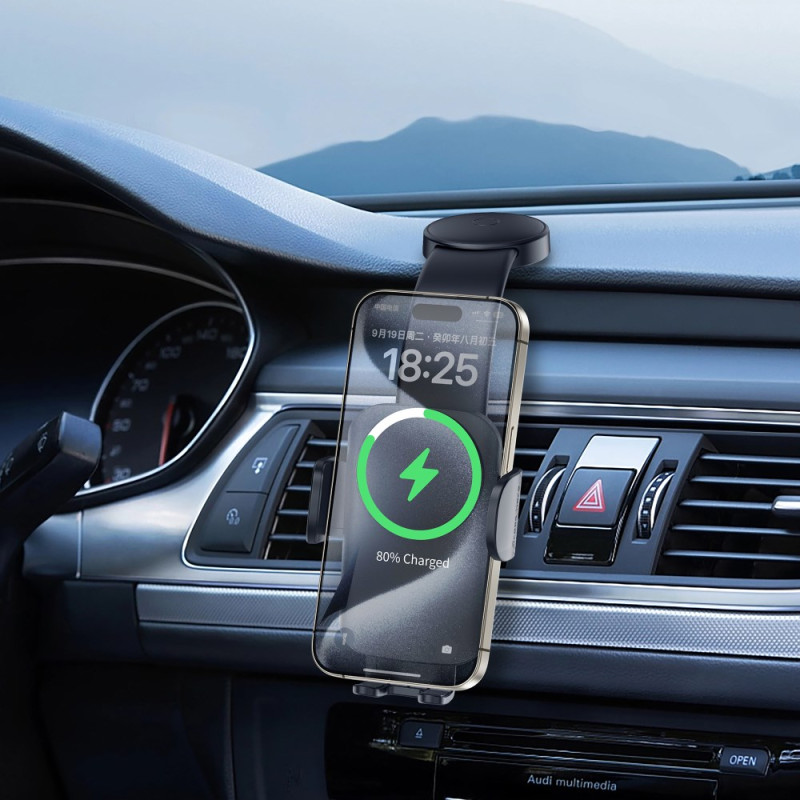 Entdecken Sie die WIWU CH-322 Autohalterung: ein superschnelles 15W kabelloses Ladegerät mit intelligenter automatischer Klemmung. Platzieren Sie einfach Ihr Handy und lassen Sie die Arme automatisch zuklappen, um einen sicheren Halt zu gewährleisten. Die robuste Klebebasis passt sich allen glatten Armaturenbrettern an. Ergonomisches Design, das weder Ihre Sicht noch den Ladeanschluss Ihres Geräts behindert.