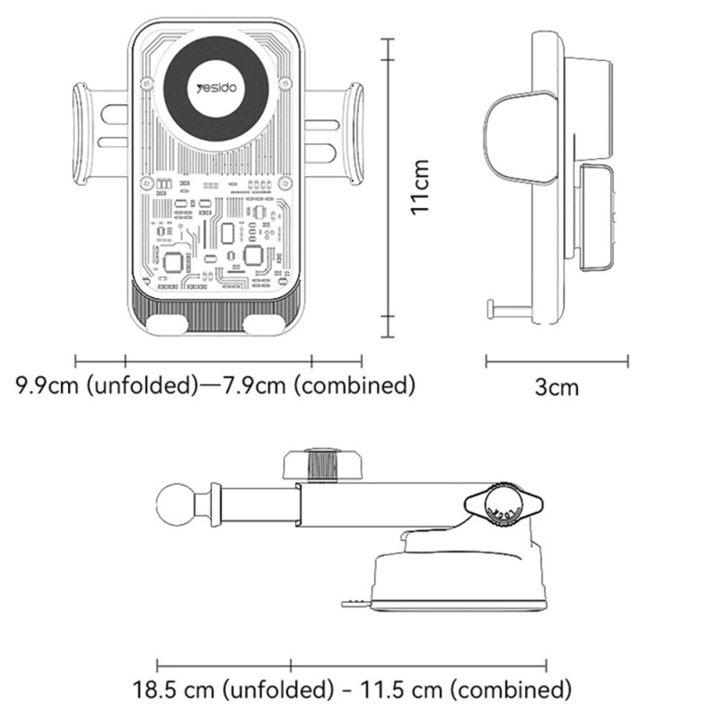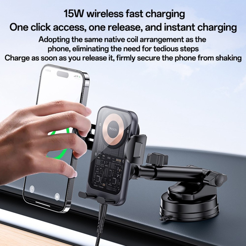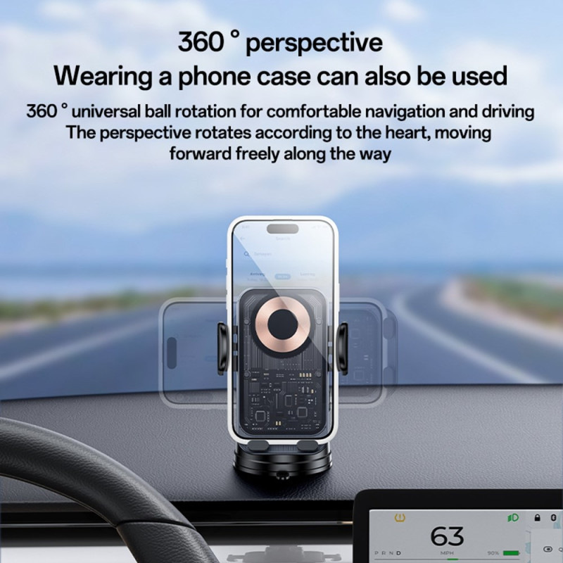 Verwandeln Sie Ihre Fahrt mit dieser Smartphone-Halterung mit kabellosem 15W-Ladegerät. Ausgestattet mit einer praktischen automatischen Klemmung, einem um 360° drehbaren Saugnapf und starken Magneten für eine sichere Befestigung. Kompatibel mit allen Qi-Geräten für schnelles Aufladen während der Fahrt.