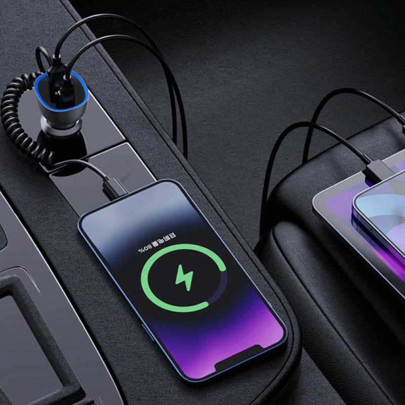 Chargeur voiture intelligent GE05 offrant une charge rapide PD 65W avec câble Type-C rétractable intégré. Équipé d'un écran affichant la tension en temps réel et de deux ports (USB-C 65W + USB-A 18W) pour recharger plusieurs appareils simultanément...