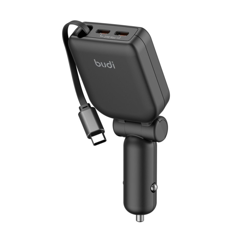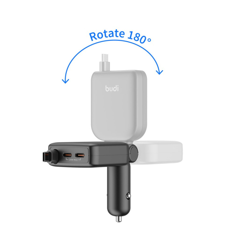 Intelligentes 50-W-Autoladegerät mit 72 cm langem, einziehbarem Type-C-Kabel und 2 zusätzlichen Anschlüssen. Innovatives faltbares Design für einen verstellbaren Ladewinkel. Laden Sie bis zu 3 Geräte gleichzeitig mit optimaler Leistung auf.