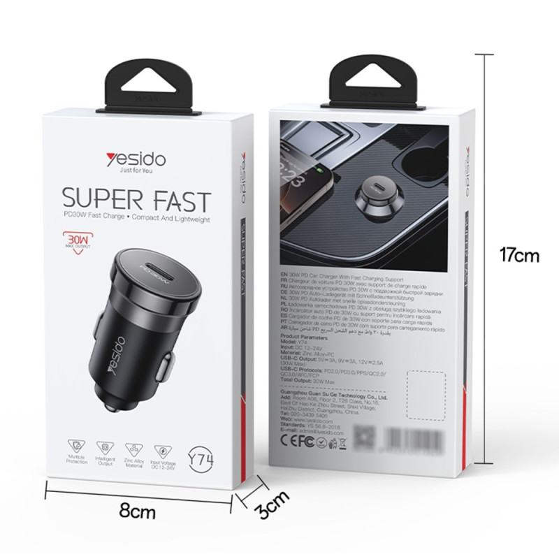 Erleben Sie ultraschnelles 30-W-Laden mit dem YESIDO Y74. Kompatibel mit all Ihren Geräten dank der Protokolle PD3.0, PPS und QC3.0. Kompaktes und elegantes Design, perfekt für unterwegs. Robuste Konstruktion für optimale Haltbarkeit. Passend für alle Fahrzeuge mit 12-24-V-Eingang.