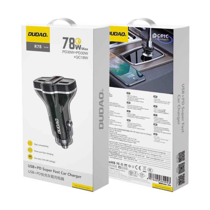 Laden Sie alle Ihre Geräte unterwegs mit dem DUDAO R78 Autoladegerät auf. Mit 3 Schnellladeanschlüssen (2x USB-C PD 30W + 1x USB-A QC 18W) liefert es eine Gesamtleistung von 78W, um Ihr iPhone und andere Geräte gleichzeitig aufzuladen.