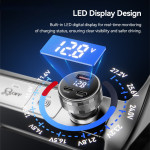 Hochleistungs-Autoladegerät 108W mit dualem USB-C-Anschluss 45W und USB-A-Anschluss 18W. Power-Delivery-Technologie für ultraschnelles Aufladen Ihrer Geräte. Integrierter LED-Bildschirm zur Überwachung in Echtzeit. Kompatibel mit Smartphones, Tablets und Laptops.