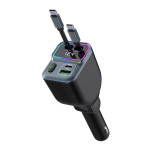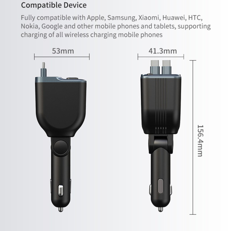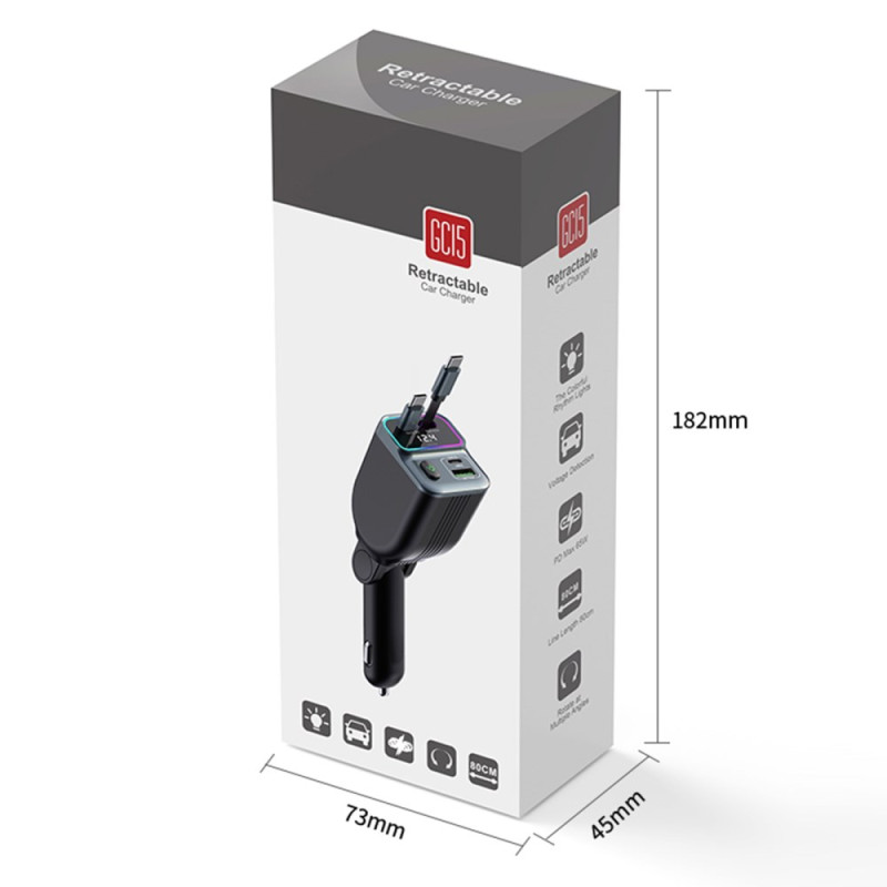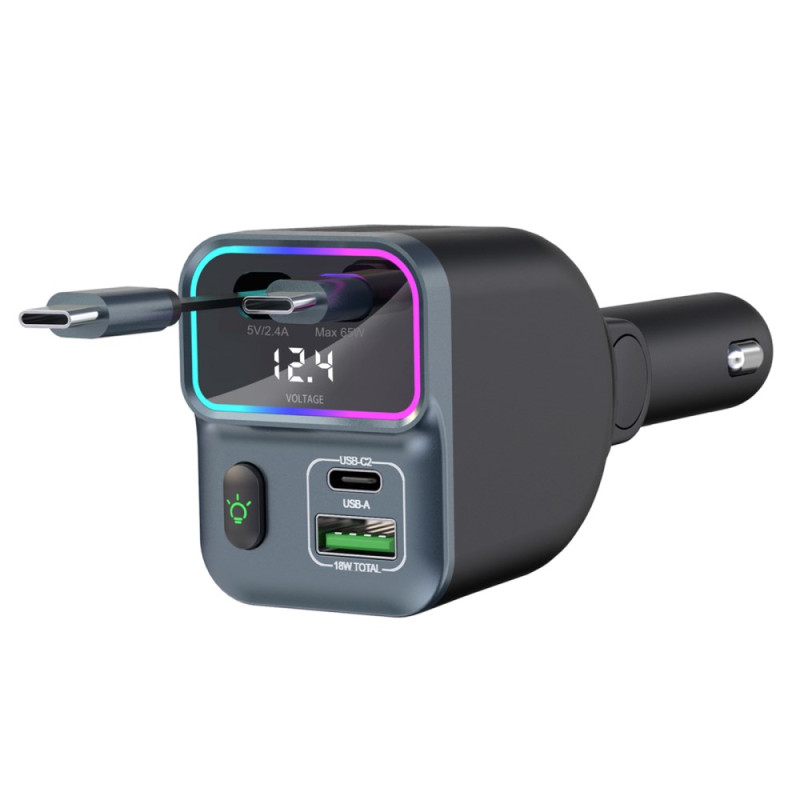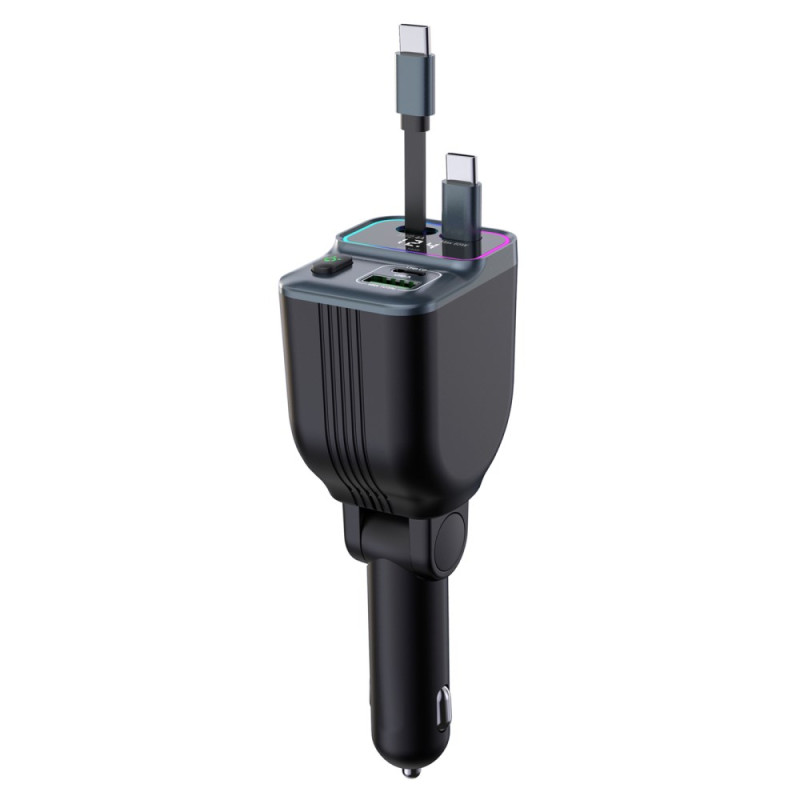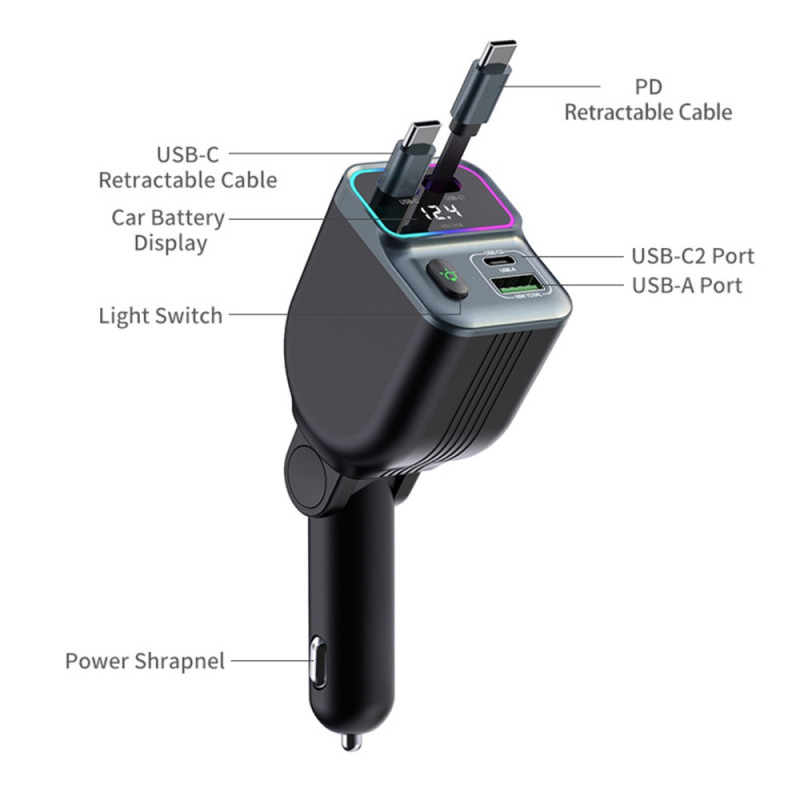Hochleistungs-Autoladegerät mit integrierten, einziehbaren Doppel-USB-C-Kabeln und Echtzeit-Spannungsmonitor. Kombinierte Leistung von 83 W für das gleichzeitige schnelle Aufladen Ihrer Geräte. Kompatibel mit allen Smartphones und 12V/24V-Fahrzeugen.