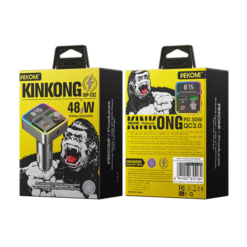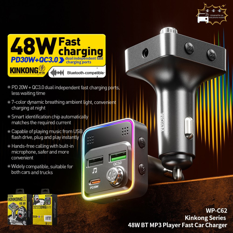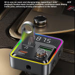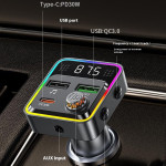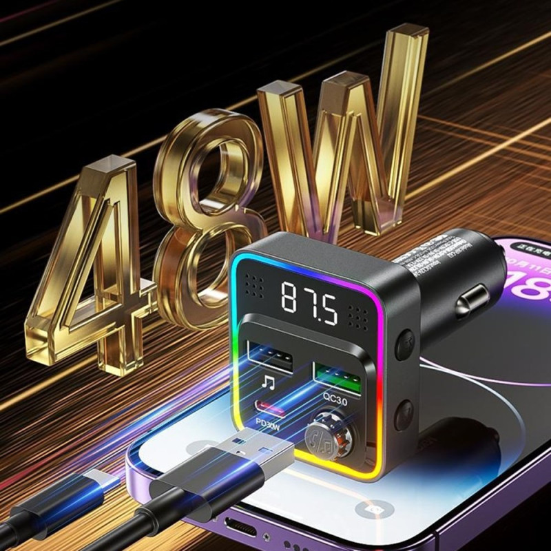 Intelligentes 48-W-Autoladegerät mit zwei Schnellladeanschlüssen (PD30W + QC3.0), integriertem MP3-Player und 7-farbigem Umgebungslicht. Genießen Sie Bluetooth-Freisprechanrufe und eine optimale Aufladung all Ihrer Geräte. Kompatibel mit 12V-24V.