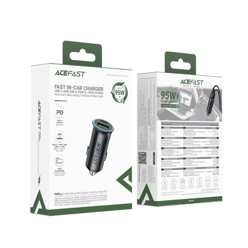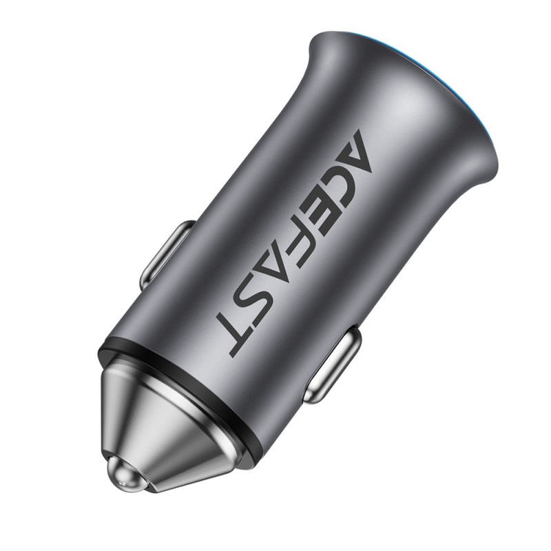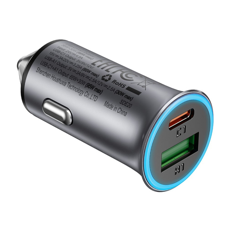Extrem leistungsstarkes Dual-Port-Autoladegerät mit einer kombinierten Leistung von bis zu 95 W. Genießen Sie das gleichzeitige Schnellladen über USB-C (65W) und USB-A (30W). Kompaktes, elegantes Design mit eisblauem Leuchtring für einen stimmungsvollen Akzent.