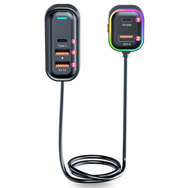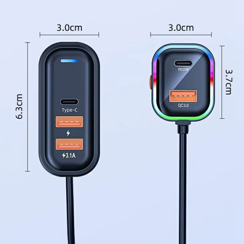 Verwandeln Sie Ihr Auto in eine vielseitige Ladestation! Dieses Multiport-Ladegerät bietet 30W PD- und QC 3.0-Schnellladung für all Ihre Geräte. Mit dem 1 m langen Verlängerungskabel und der eleganten Ambientebeleuchtung können Sie bis zu 5 Geräte gleichzeitig von den Vorder- und Rücksitzen aus aufladen.