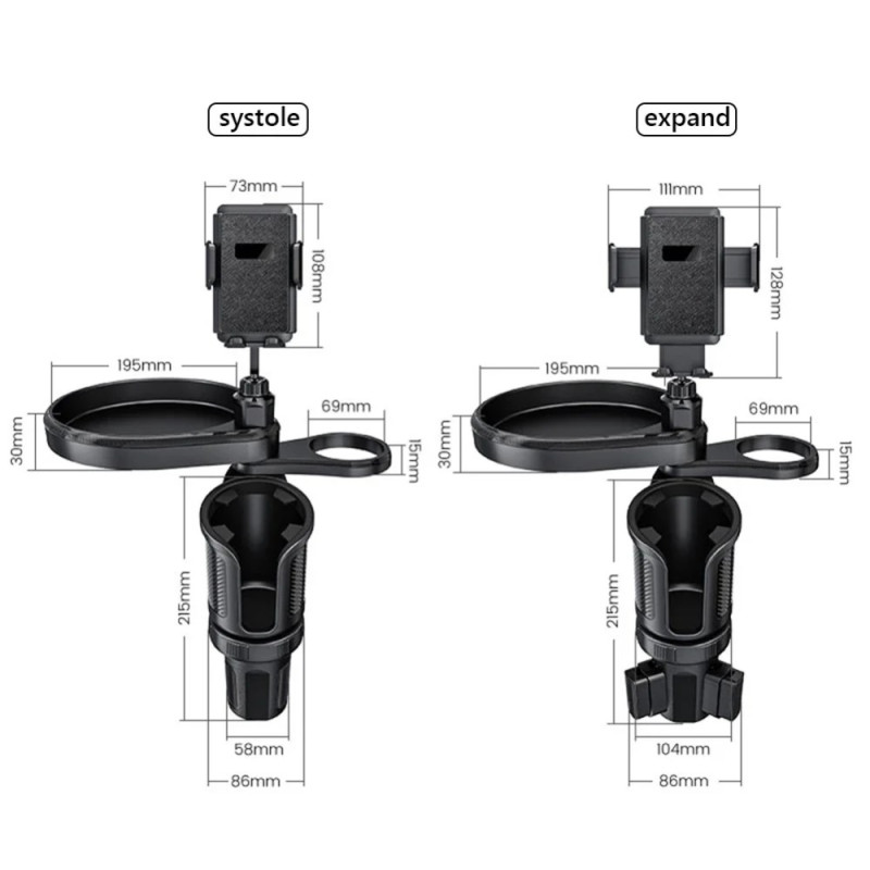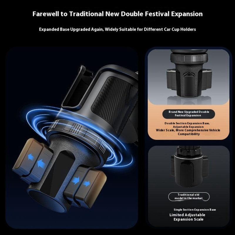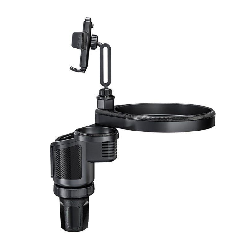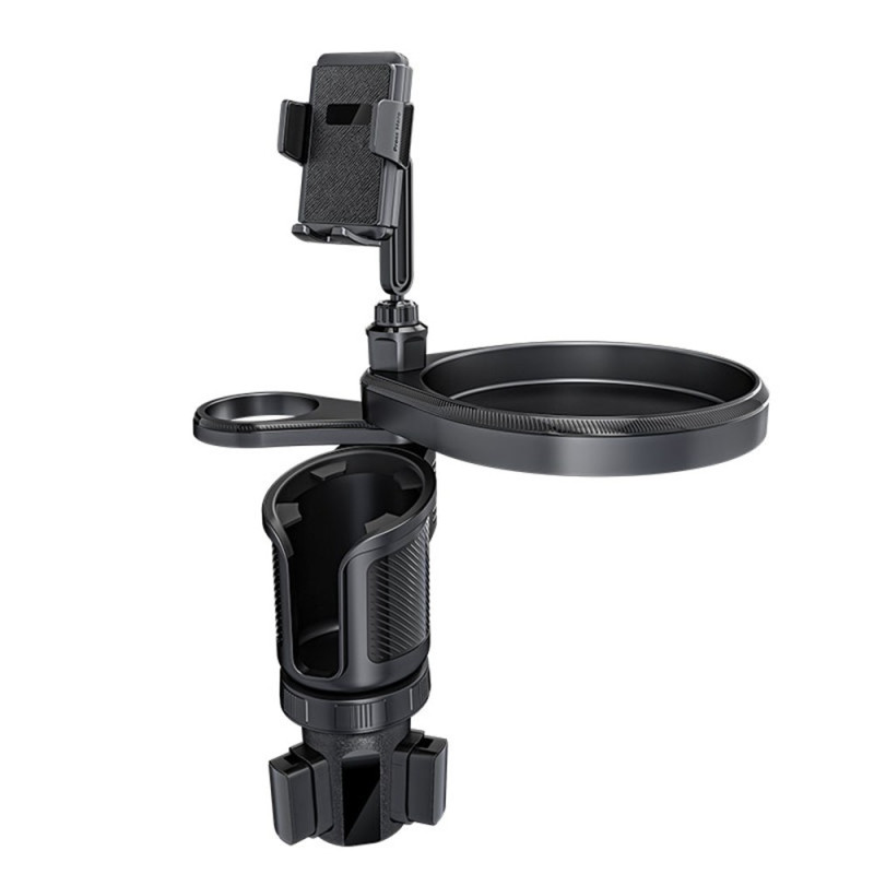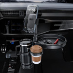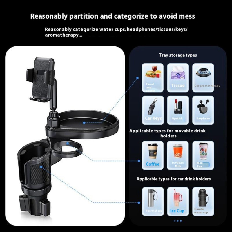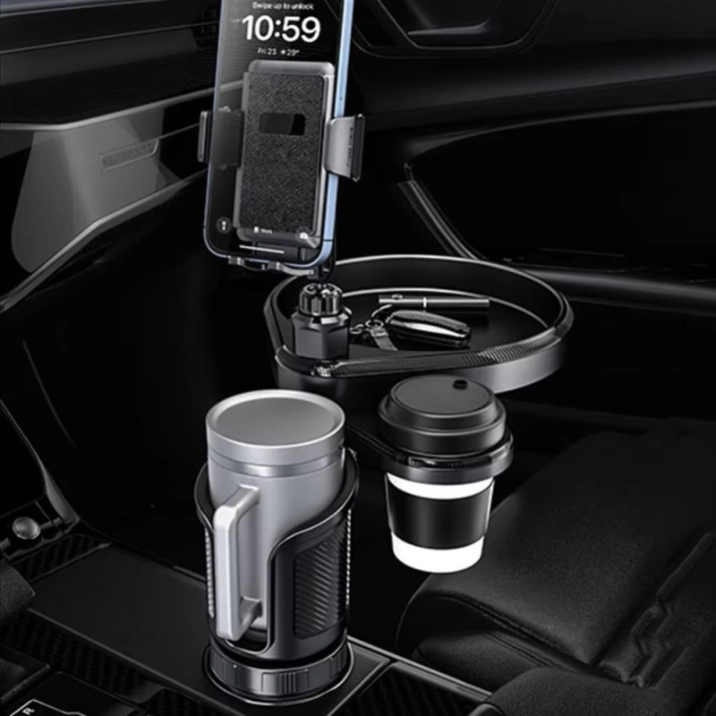 Verwandeln Sie Ihren Becherhalter in eine Multifunktionsstation! Diese universelle 4-in-1-Halterung kombiniert einen um 360° drehbaren Telefonhalter, eine Ablagefläche und doppelte Getränkehalter. Einfache Installation durch einfaches Drehen, kompatibel mit den meisten Fahrzeugen.