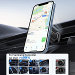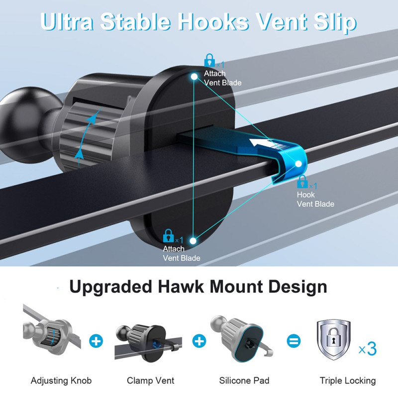 Die magnetische, um 360° drehbare Telefonhalterung für Lüftungsgitter bietet eine sichere, stabile und praktische Befestigung für alle Ihre Fahrten. Ausgestattet mit 8 doppellagigen N50-Magneten hält sie Ihr Smartphone auch auf unebenen Straßen sicher fest. Sein drehbarer Kopf ermöglicht eine nahtlose 360°-Einstellung für den idealen Blickwinkel im Hoch- oder Querformat. Sein Verriegelungssystem mit Metallhaken sorgt für einen sicheren Halt an den Lüftungslamellen. Er ist mit allen Smartphones von 4 bis 7 Zoll kompatibel und ermöglicht ein schnelles Anbringen und Entfernen mit nur einer Hand.