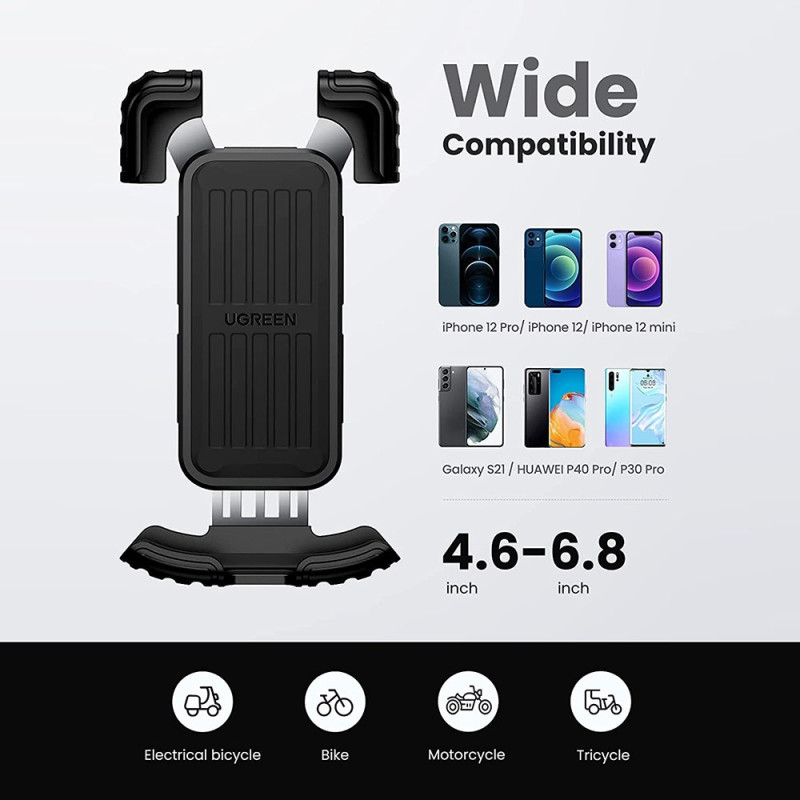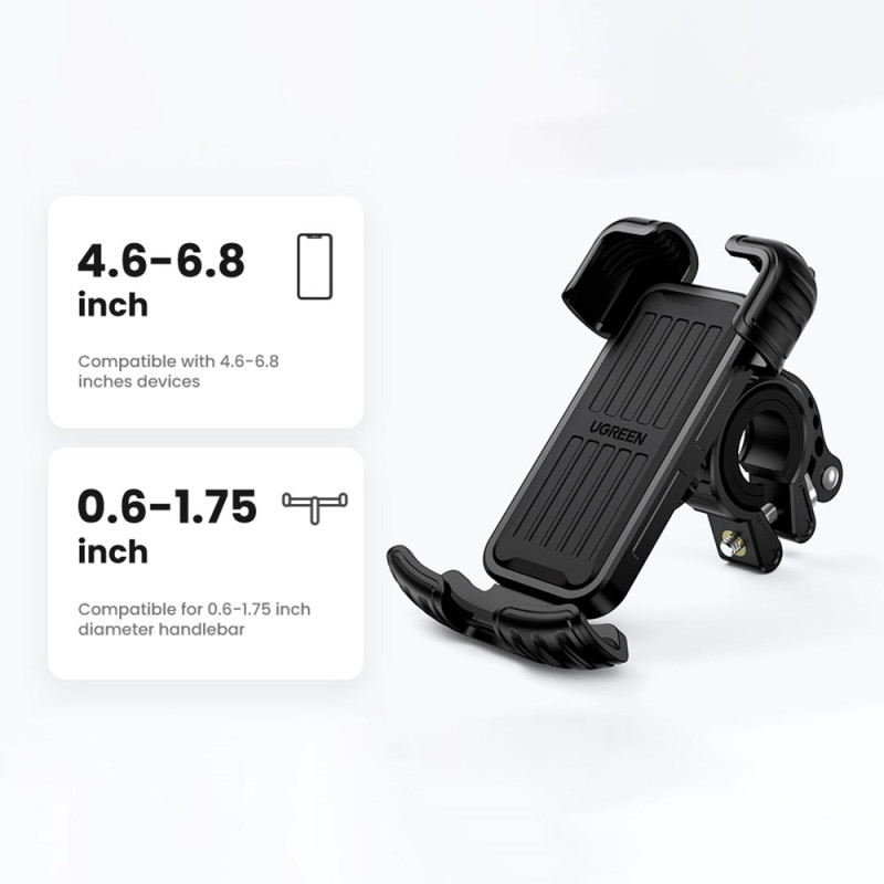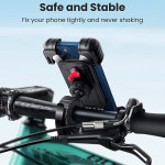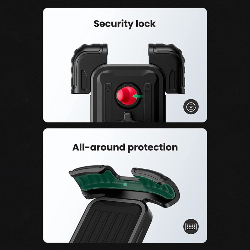 Die freie 360-Grad-Verstellbarkeit und die Einhandbedienung dienen der sicheren Navigation für alle Arten von Zweirädern. Diese Universalhalterung sichert Smartphones von 4,6 bis 6,8 Zoll durch einen doppelten Verriegelungsmechanismus, der die Metalldichtungen fest an ihrem Platz hält. Die Silikonbeschichtung absorbiert Stöße und schützt das Telefon vor Kratzern. Die einfache Schraubbefestigung passt an Lenker von 15 bis 44,5 mm und deckt Motorräder, Elektrofahrräder und Kinderwagen ab. Durch die vollständige Drehung ist der optimale Blickwinkel jederzeit gewährleistet, auch während der Fahrt.