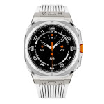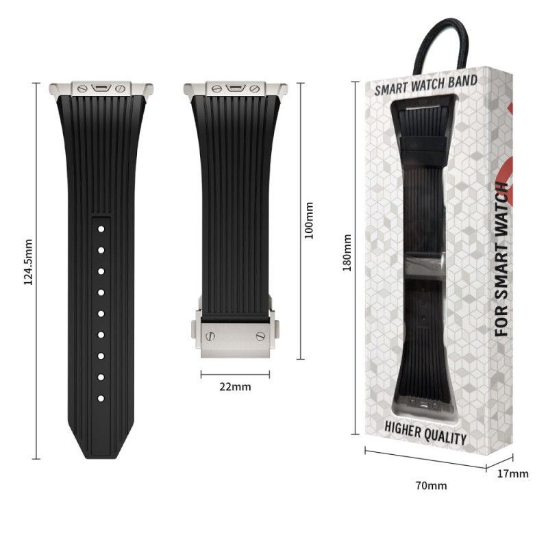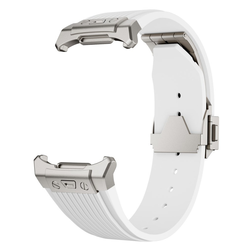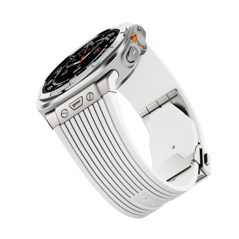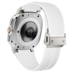 Entdecken Sie unser Silikonarmband für die Samsung Galaxy Watch Ultra 47mm. Es ist weich, flexibel und bequem und verfügt über eine silberne Faltschließe für einen sicheren und einfachen Verschluss.