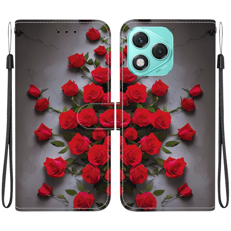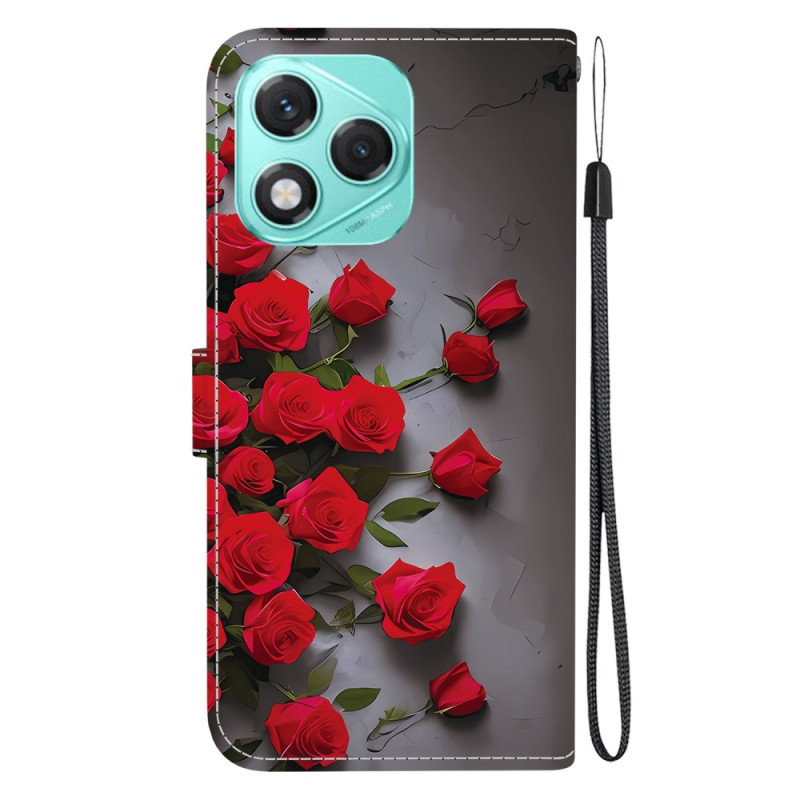 Elegante Tasche aus Kunstleder mit rosa-rotem Muster für Honor 400 Lite 5G. Verfügt über einen klappbaren Ständer, 2 Kartenfächer, ein Geldscheinfach und eine abnehmbare Handschlaufe. Sicherer Magnetverschluss für optimalen Schutz.
