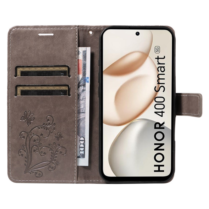Diese elegante Brieftasche für Honor 400 4G vereint Schutz und Funktionalität. Sie ist aus Premium-PU-Leder mit aufgedrucktem Schmetterlingsmuster gefertigt und bietet Kartenfächer, ein Fach für Geldscheine, eine Ständerfunktion und eine Handschlaufe. Die Innenschale aus mattem TPU bietet einen robusten Schutz und ermöglicht gleichzeitig einen einfachen Zugriff auf alle Anschlüsse und Tasten.