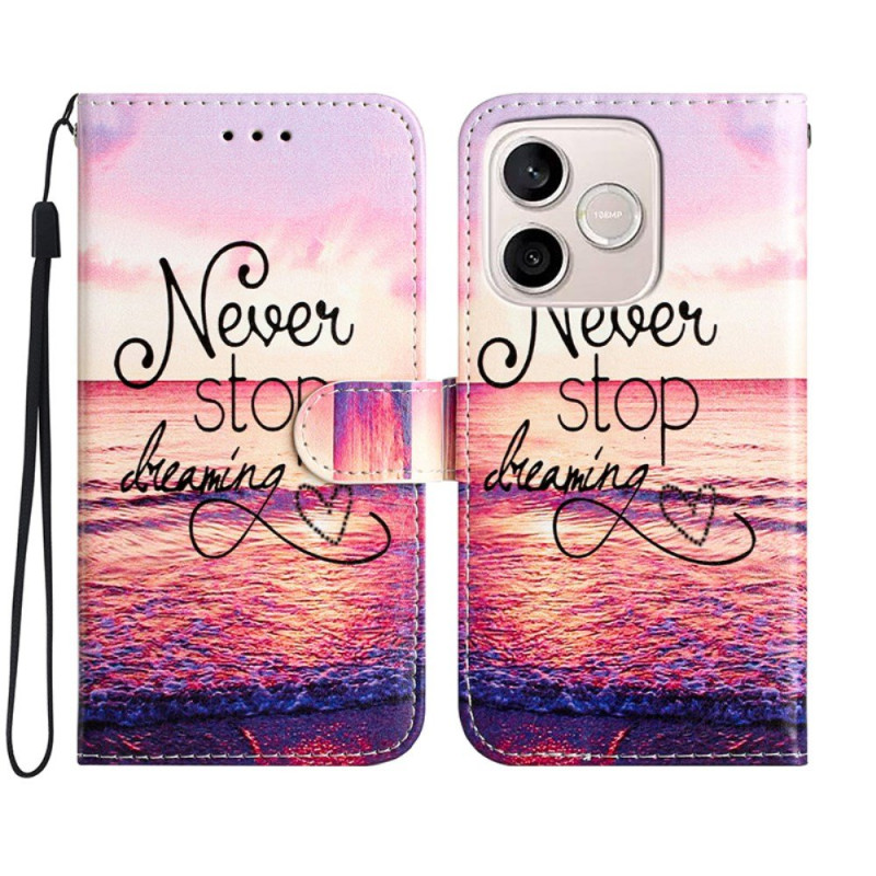 Diese Brieftasche mit dem Aufdruck "Never Stop Dreaming" passt perfekt zu Ihrem Honor 600 Lite 5G.