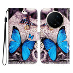 Elegante Brieftasche mit aufgedrucktem blauen Schmetterlingsmotiv für Honor Magic 8 Pro 5G. Anspruchsvolles Design mit Multi-Winkel-Haltefunktion, sicherem Magnetverschluss und abnehmbarer Handschlaufe. Schützt Ihr Handy und hält gleichzeitig Karten und Bargeld griffbereit.