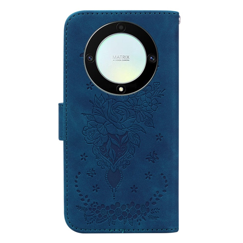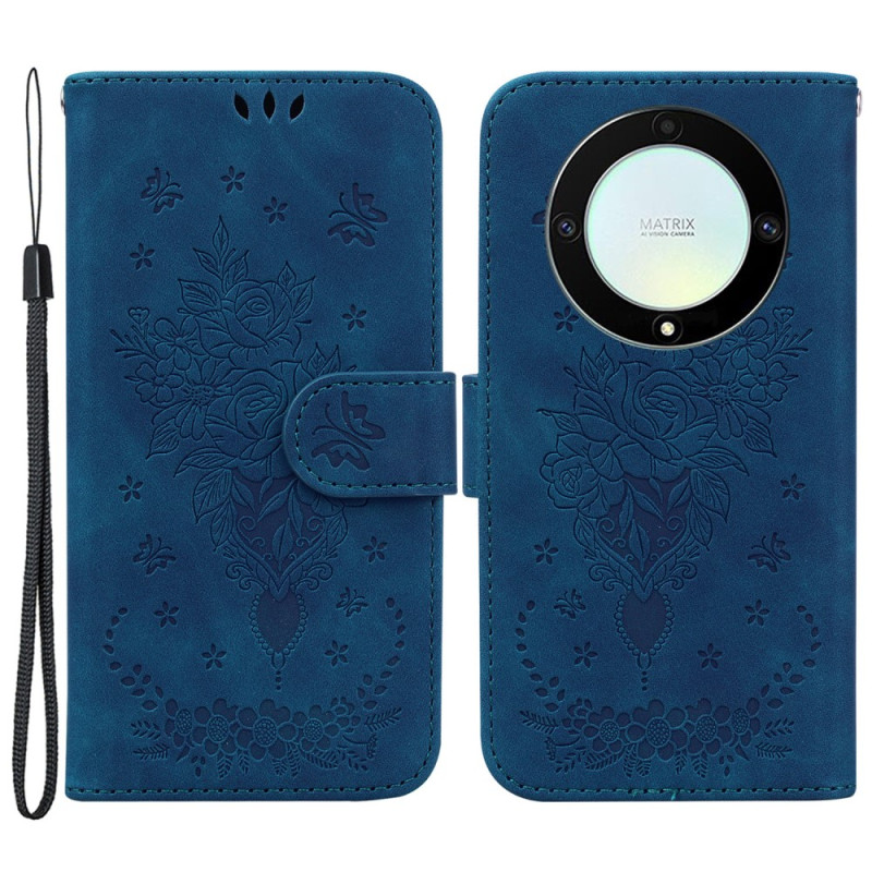 Ihr Honor Magic 5 Lite 5G / X9a ist wunderschön mit dieser mit Rosen und Schmetterlingen verzierten Hülle, die mit einem Riemen