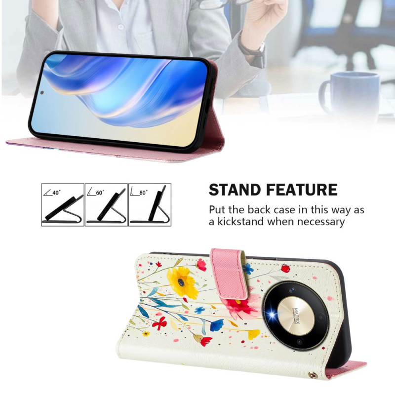 Schützen Sie Ihr Honor Magic 6 Lite / X9b stilvoll mit dieser eleganten Brieftasche mit Blumenmuster. Mit einem verstellbaren Halter mit mehreren Ecken, drei Kartenfächern und einer sicheren Handschlaufe vereint es Funktionalität und Ästhetik.
