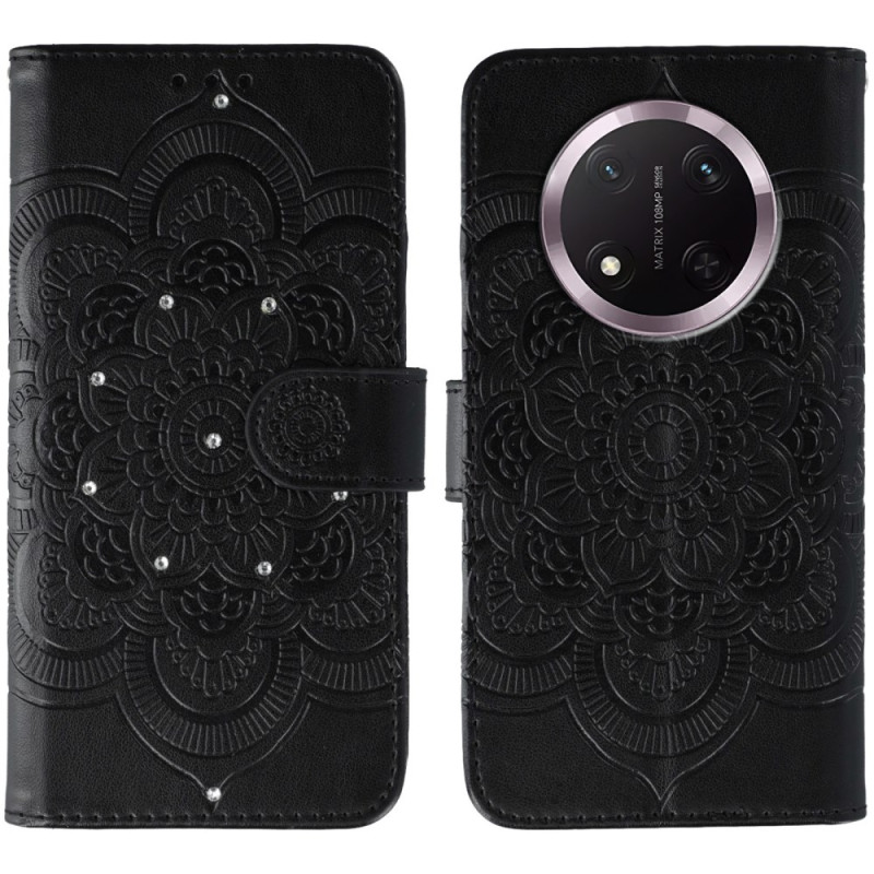 Schützen Sie Ihr Honor Magic 7 Lite / X9c elegant mit dieser edlen Hülle mit aufgedrucktem Mandala-Motiv und funkelnden Strasssteinen. Mit Karten- und Geldfächern, einer Ständerfunktion und einer praktischen Handschlaufe vereint sie Stil und Funktionalität für den Alltag.