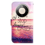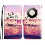 Schützen Sie Ihr Honor Magic 8 Lite stilvoll mit dieser eleganten Brieftasche mit dem inspirierenden Motiv "Never Stop Dreaming". Mit drei Kartenfächern, einer Seitentasche und einer verstellbaren Standfunktion vereint es Praktikabilität und Schutz.