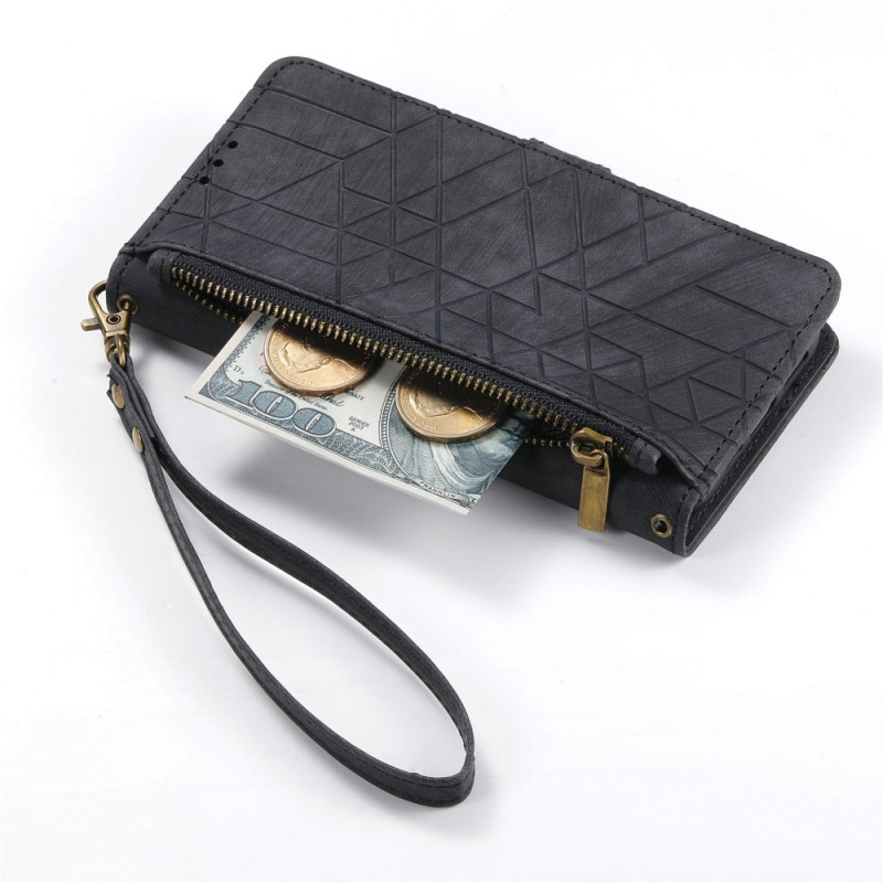 Multifunktionale Brieftasche aus Premium-PU-Leder mit Reißverschluss für Honor Magic 8 Pro 5G. Elegantes geometrisches Design, 3 Kartenfächer, sichere Reißverschlusstasche und integrierte Halterungsfunktion.