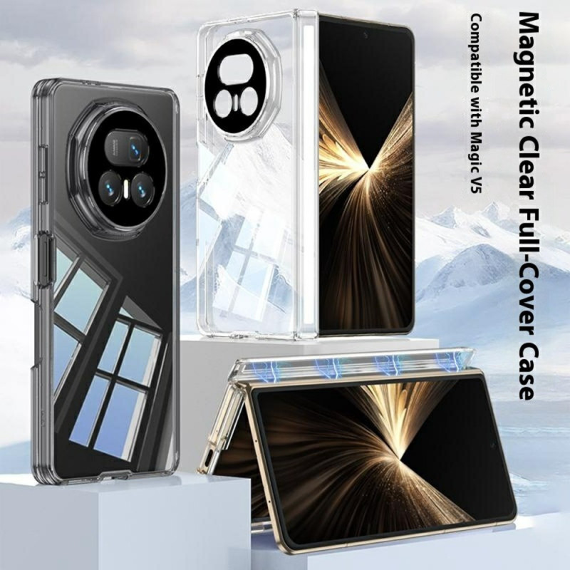 Entdecken Sie unsere Rundum-Schutzhülle für Honor Magic V5 5G. Sie besteht aus strapazierfähigem TPU, bietet umfassenden Schutz vor Stürzen und Kratzern und bewahrt gleichzeitig die ursprüngliche Ästhetik Ihres Geräts. Das Design mit magnetischem Scharnier sorgt für eine perfekte Passform und schützt den Klappmechanismus.