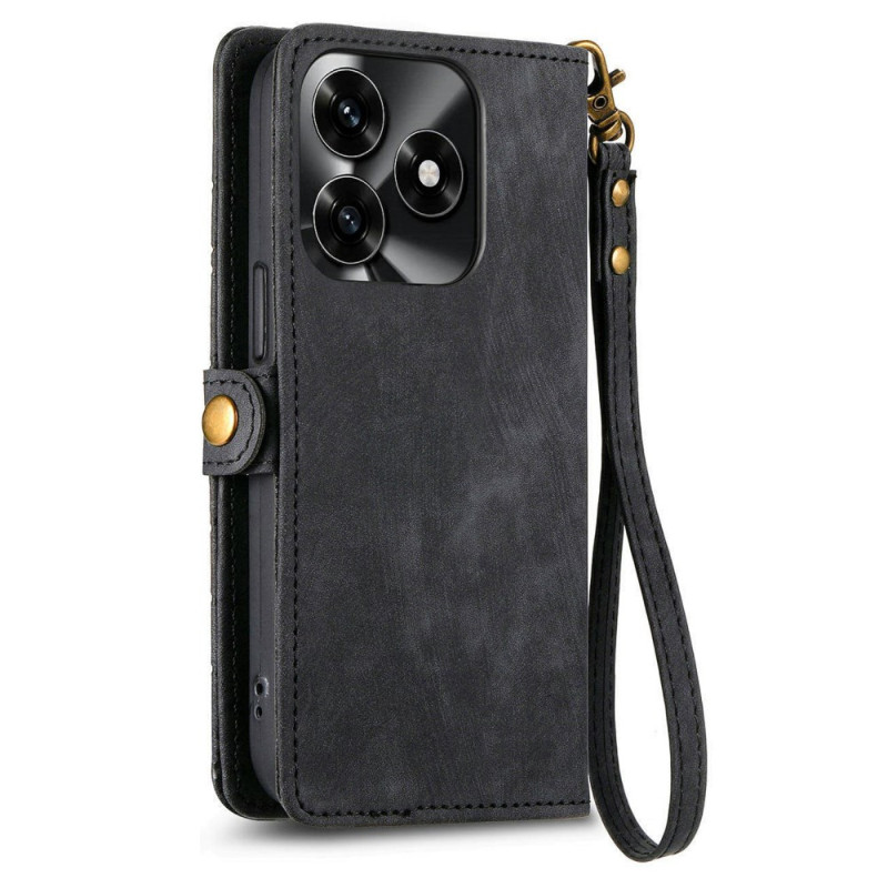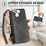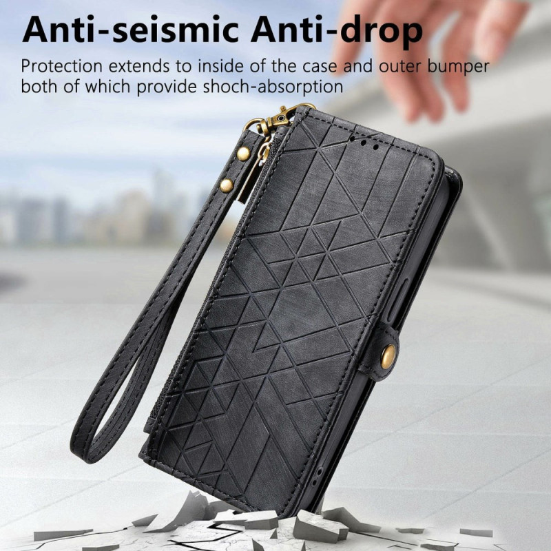 Étui portefeuille élégant en cuir PU avec motif géométrique pour Honor X5c Plus 4G. Dispose de 3 fentes pour cartes, 1 poche pour espèces, une poche zippée extérieure et une dragonne amovible. Protection intégrale avec fonction support pour un visionnage mains libres.