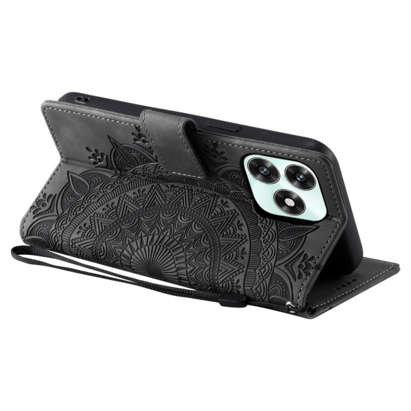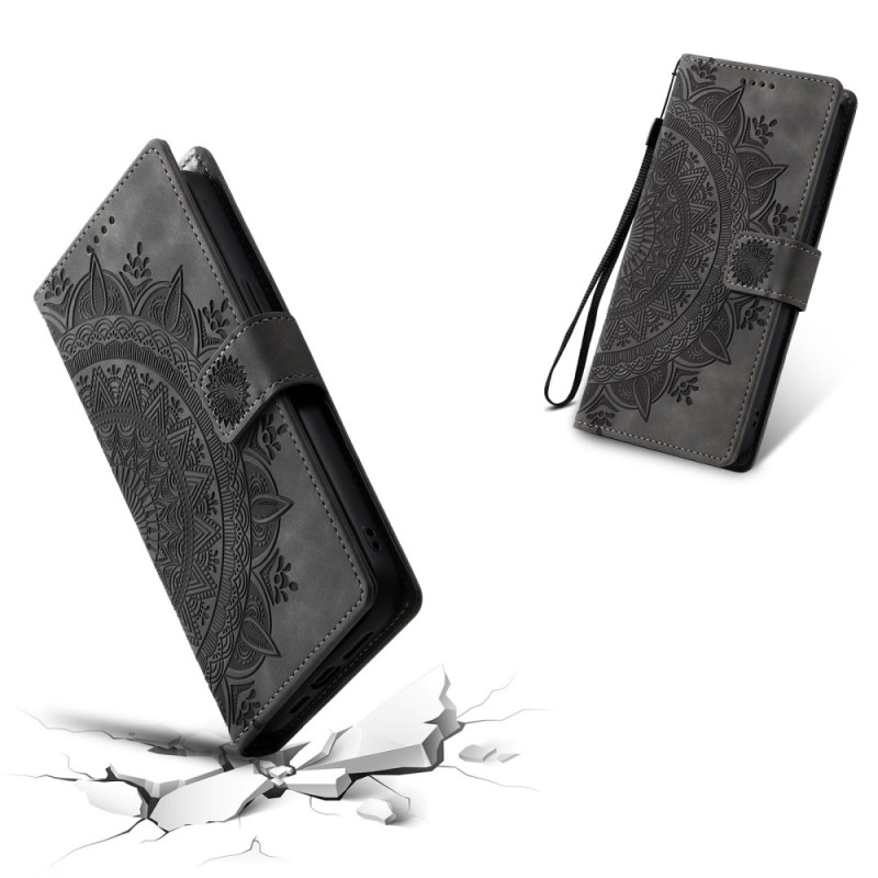Étui portefeuille élégant en cuir PU avec motif mandala imprimé. Comprend 3 emplacements pour cartes, un compartiment pour espèces, une fermeture magnétique et une dragonne pratique. Support intégré pour un visionnage mains libres.