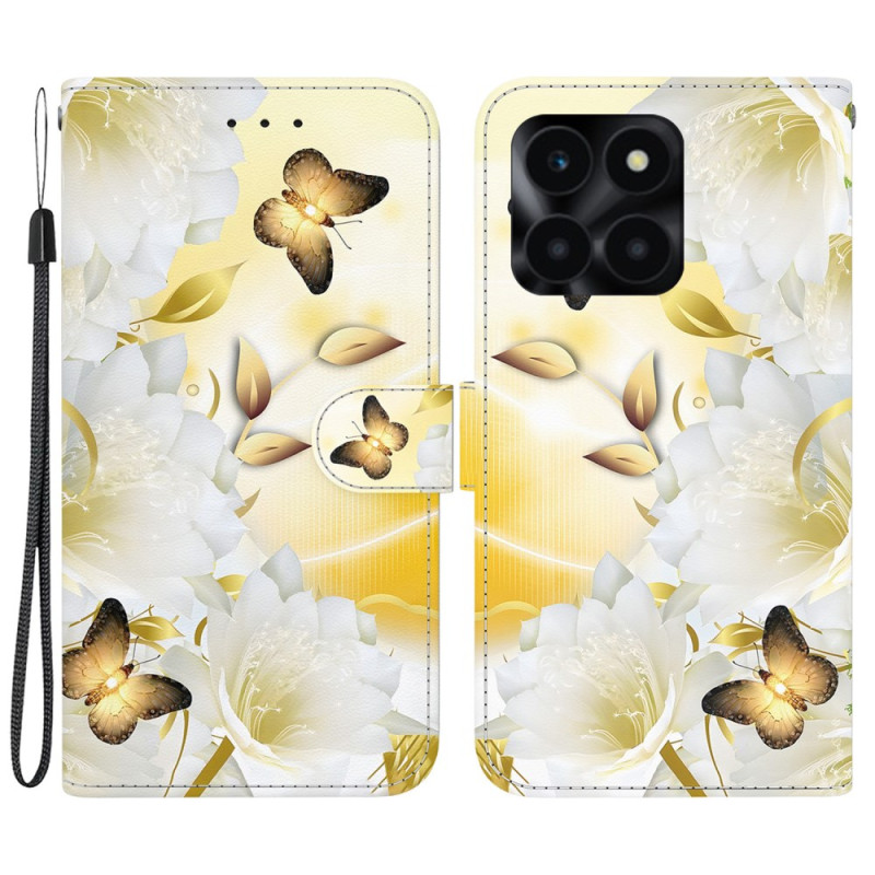 Housse Honor X6a 4G Papillons Dorés et Fleurs Blanches
