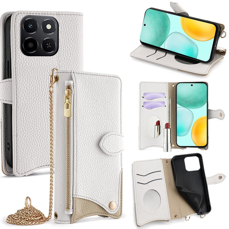 Elegante Brieftasche aus strukturiertem PU-Leder und weicher TPU-Hülle für Honor X6c 4G. Einzigartiges, unregelmäßiges Fishtail-Design mit 2 Kartenfächern, Geldscheinfach, Reißverschlussfach und integriertem Kosmetikspiegel. Inklusive einer 1,2 m langen Schulterkette.