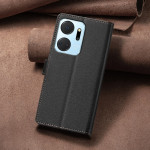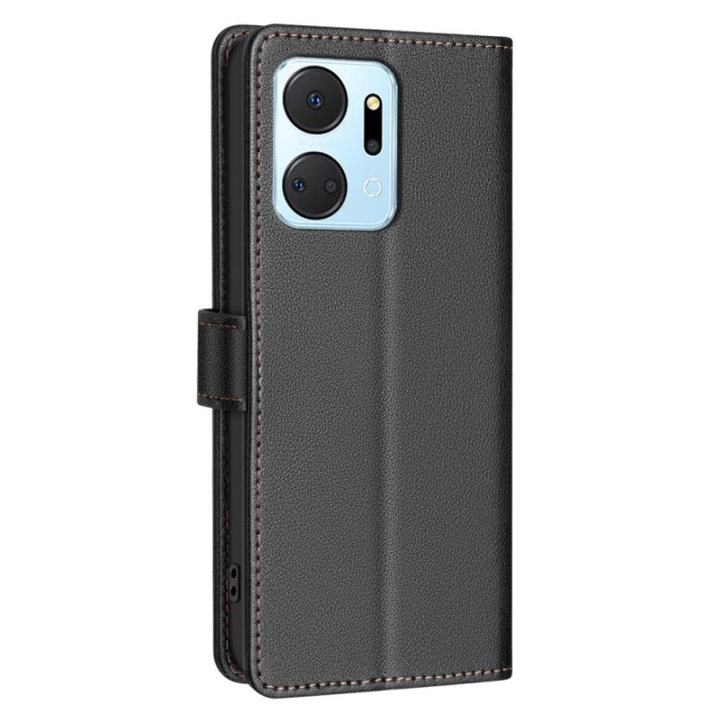 Tasche aus PU-Leder mit Premium-Litschi-Textur für Honor X7a 4G. Ausgestattet mit 3 Kartenfächern, 1 Geldfach und Anti-RFID-Technologie. Sicherer Magnetverschluss und Freisprechfunktion für optimalen Komfort im Alltag.