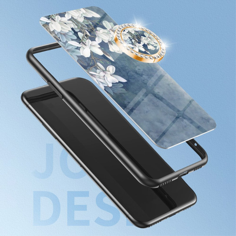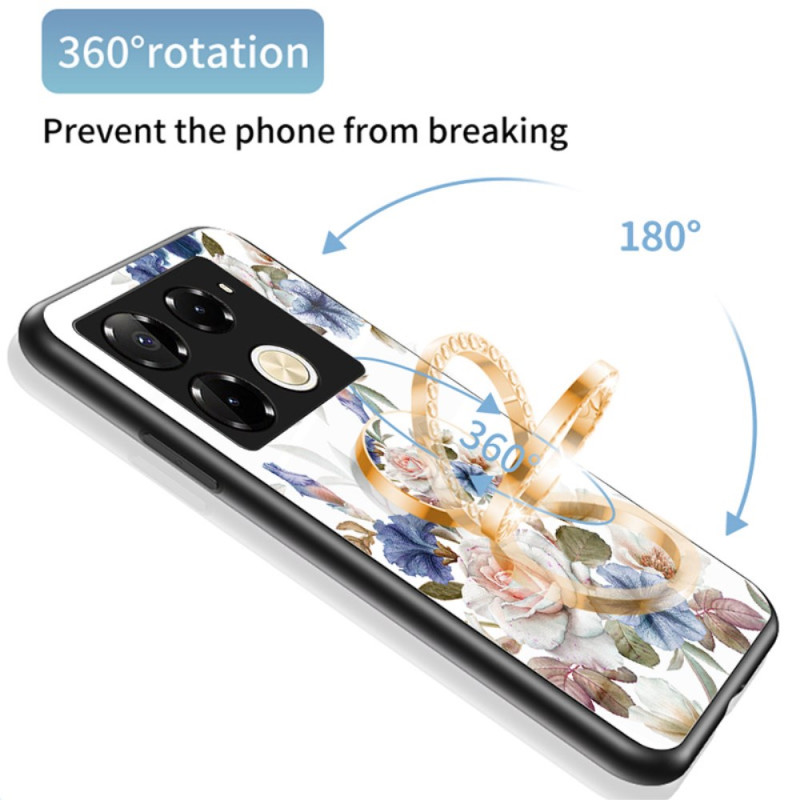 Schützen Sie Ihr Infinix Note 40 Pro 4G mit dieser eleganten Hülle mit Blumenmuster. Ausgestattet mit einem faltbaren Stützring mit Strasssteinen, einer Rückseite aus strapazierfähigem gehärtetem Glas und einer integrierten Metallplatte als Magnethalterung.